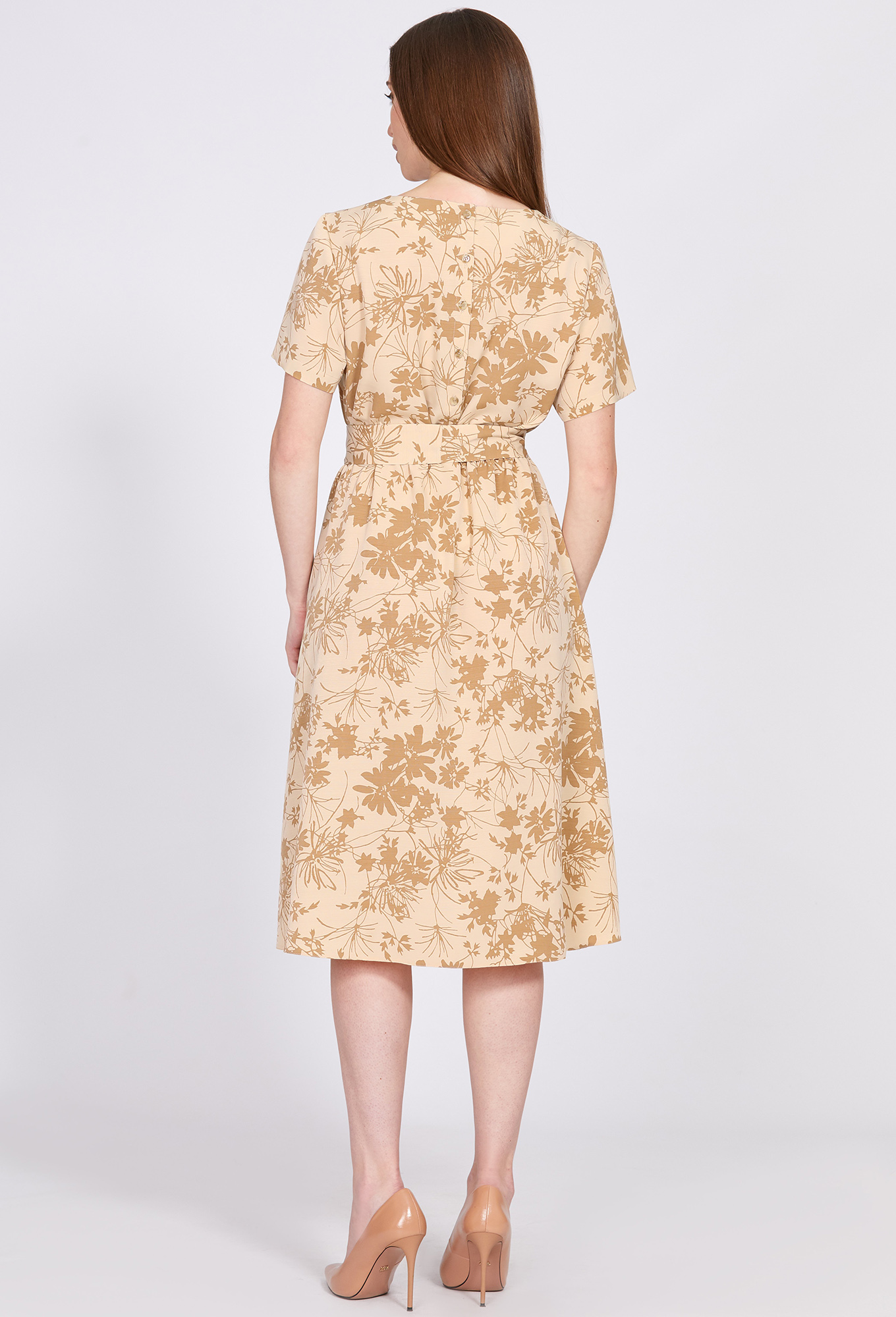 Модель: Солеи 4664 бежевый цветы ..показатьРост: 170 см (девушка на фото ростом 170см) Сезон: Весна-Лето Тип ткани: 100% ПолиэстерЭлегантное платье-миди Х-образного силуэта, отрезная по линии талии и собранная на эластичную тесьму, с округлой формой горловины и втачными короткими рукавами. Лиф по переду со складками и щелевидным разрезом с отделочной пуговицей, по спинке - с застежкой на петли и пуговицы. Завершает образ тканевый пояс в тон, подчеркивающий изящную женскую талию.