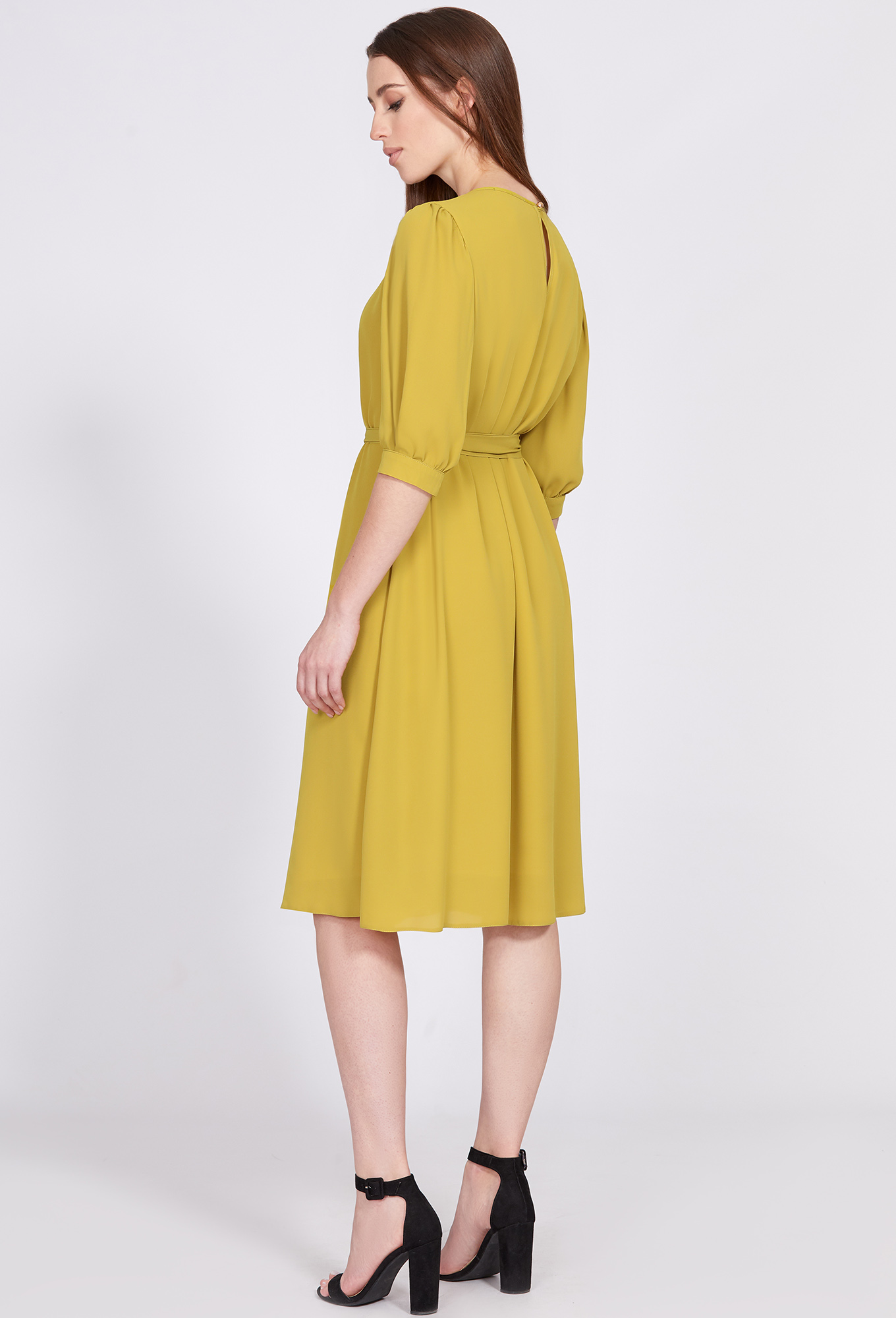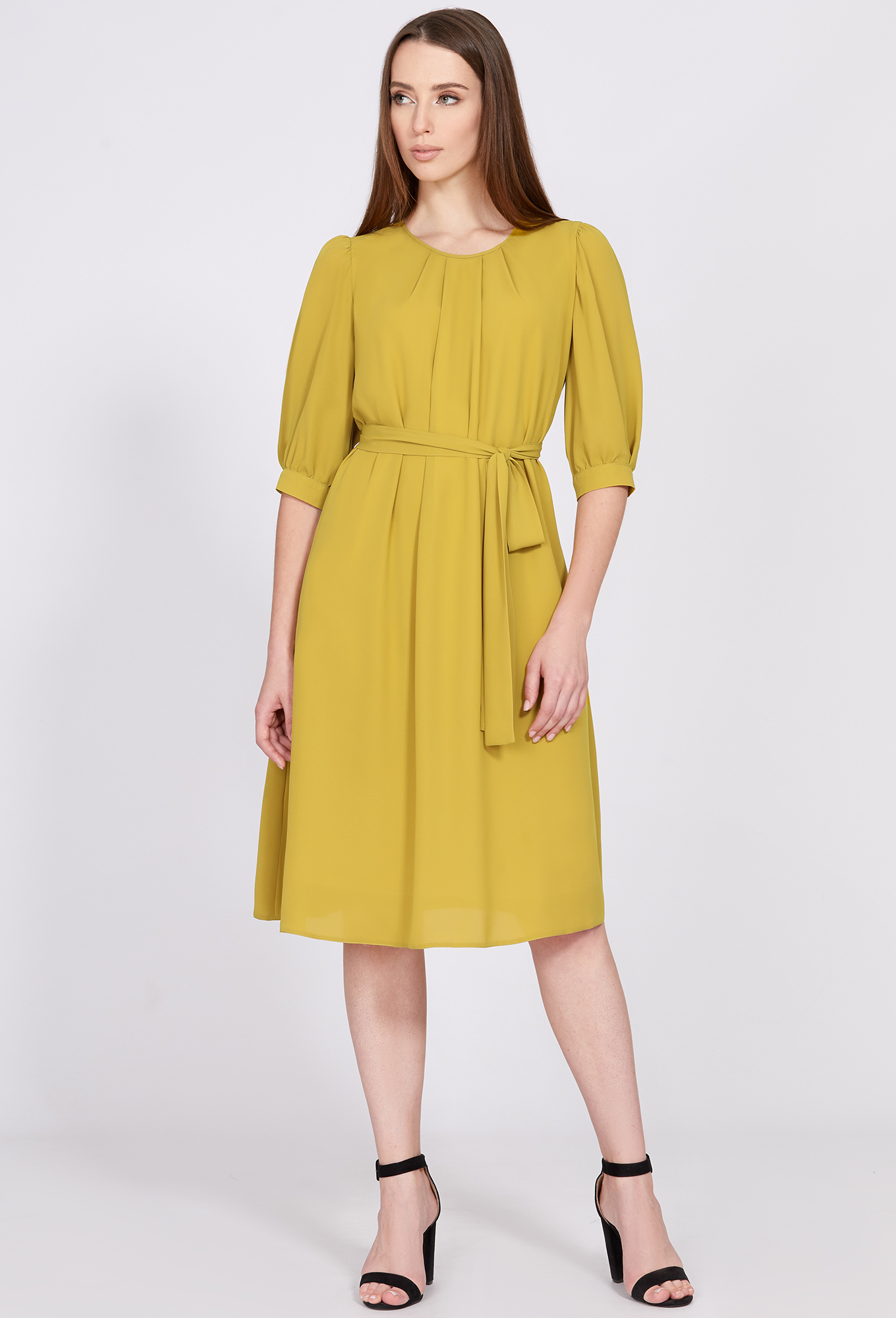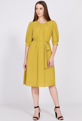 Модель: Солеи 4742 олива Рост: 17..показать0 см (девушка на фото ростом 170см) Сезон: Весна-Лето Тип ткани: 100% ПолиэстерПлатье А-образного силуэта выполнено из приятной ткани. Привлечь особое внимание к себе помогает интересный крой со складками по горловине переда платья и интересное сочетание сборки и встречной складки по рукавам. Модель с округлой формой горловины и с втачными укороченными рукавами с притачными манжетами. Для удобства в эксплуатации, по спинке обработана каплевидная застёжка на навесную петлю и пуговицу. Завершает модель пояс-завязка из основной ткани.
