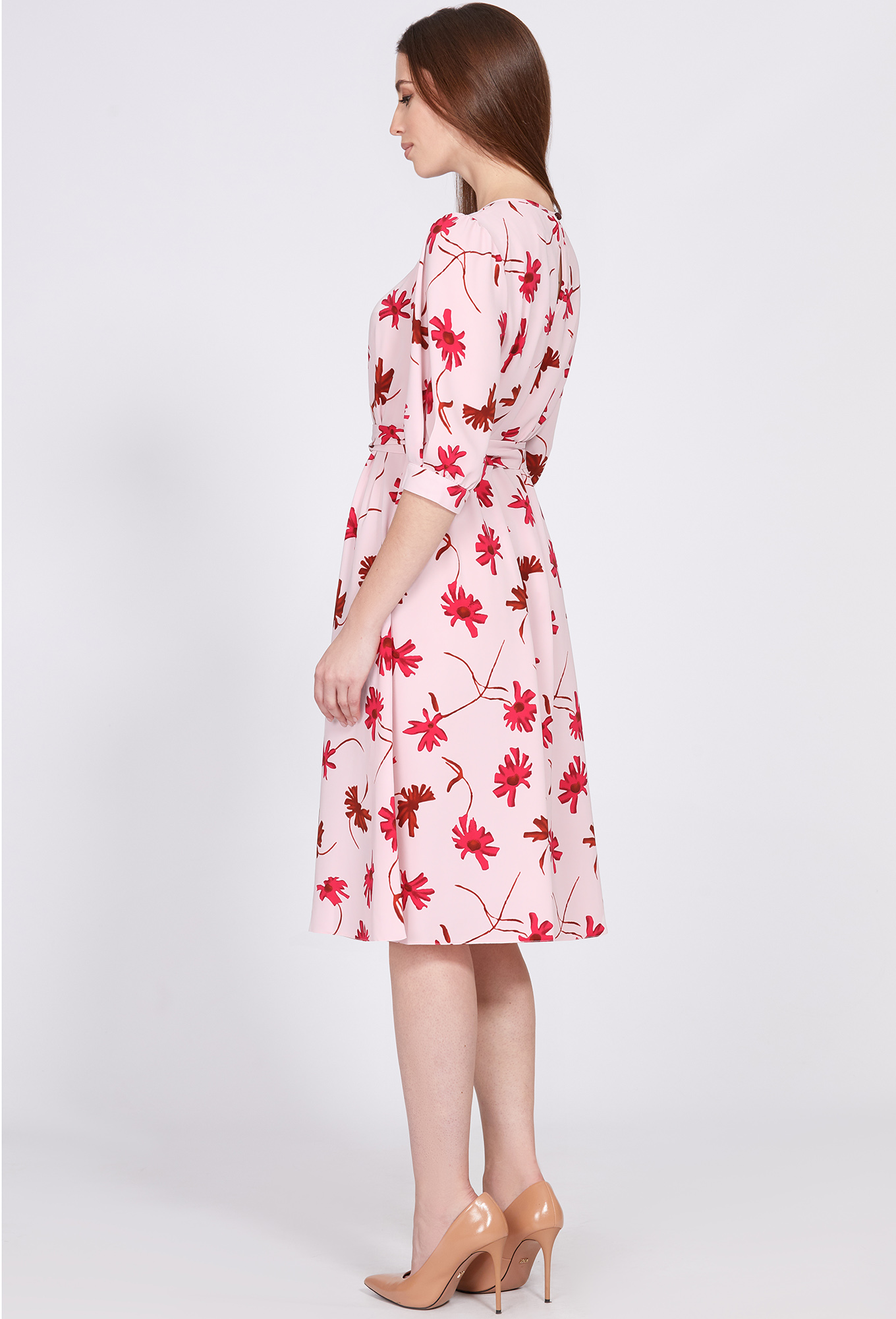 Модель: Солеи 4742 розовый цветы ..показатьРост: 170 см (девушка на фото ростом 170см) Сезон: Весна-Лето Тип ткани: 100% ПолиэстерЧрезвычайно нежное платье А-образного силуэта выполнено из мягкой приятной ткани с принтом. Привлечь особое внимание к себе помогает интересный крой со складками по горловине переда платья и интересное сочетание сборки и встречной складки по рукавам. Модель с округлой формой горловины и с втачными укороченными рукавами с притачными манжетами. Для удобства в эксплуатации, по спинке обработана каплевидная застёжка на навесную петлю и пуговицу. Завершает модель пояс-завязка из основной ткани.