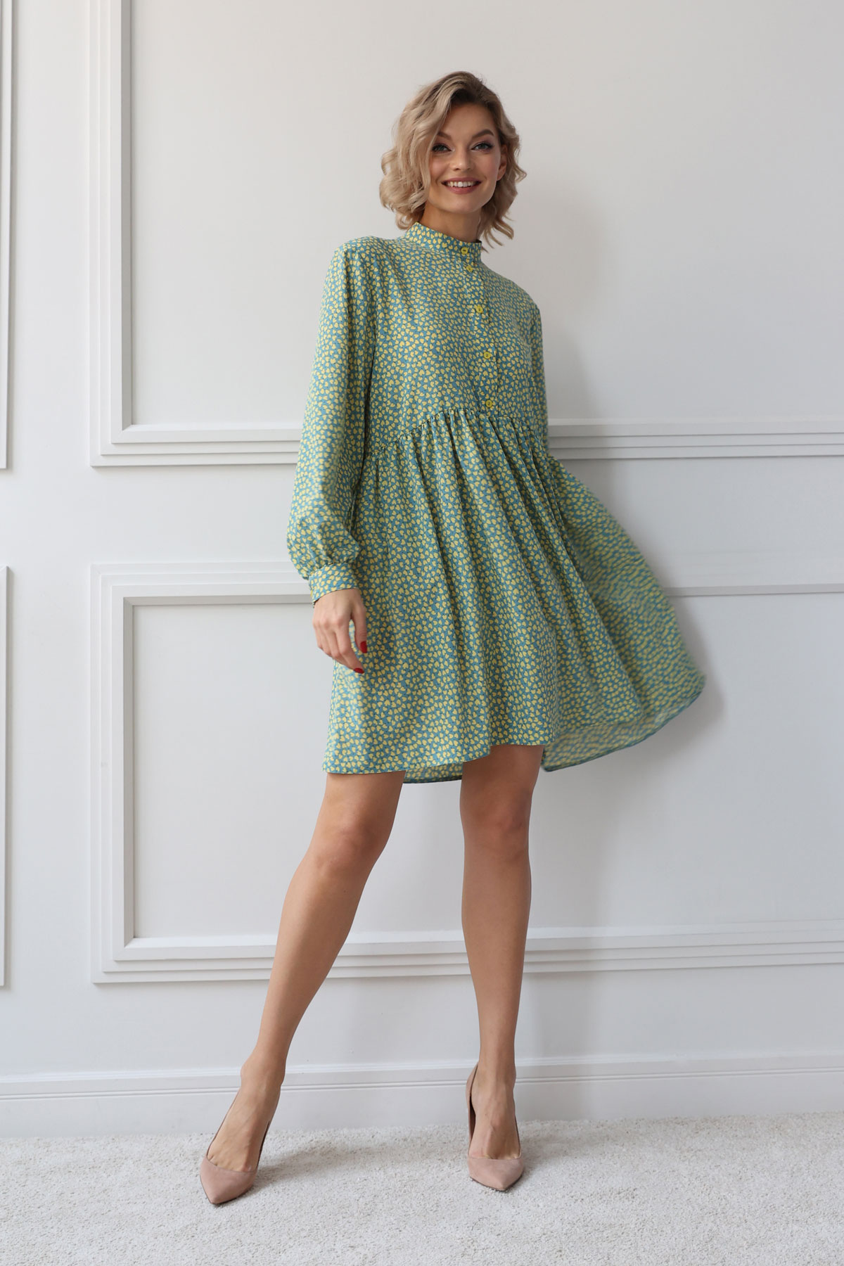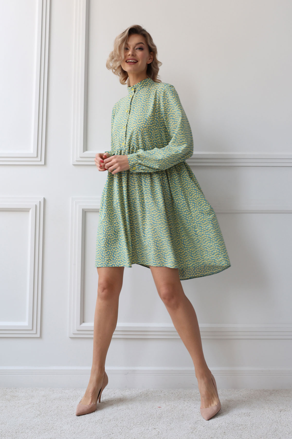 Платье асимметричного кроя отрезное по линии талии. Спинка изделия длиннее переда.