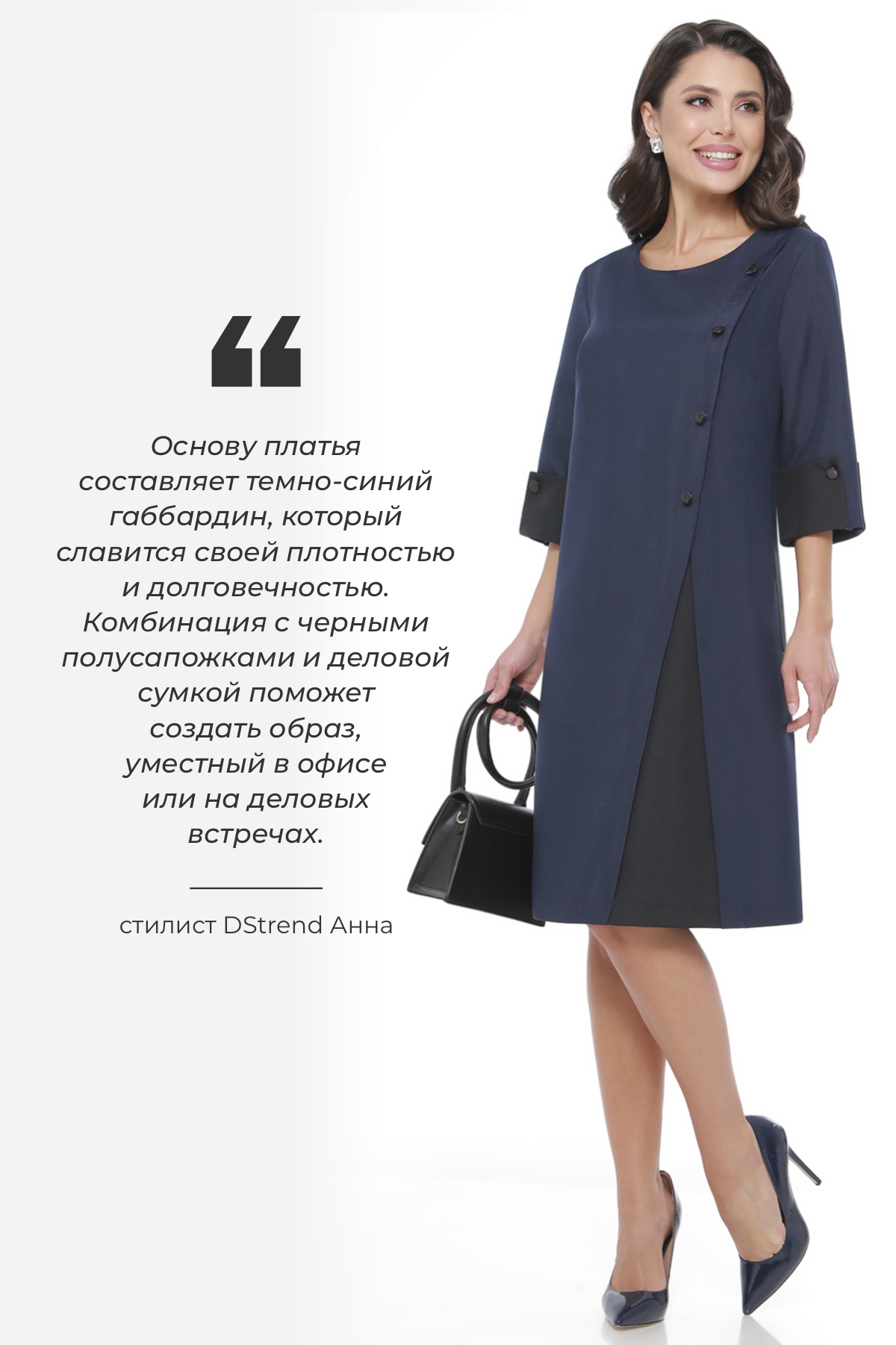 Новое прочтение платьев с асимметрией. Диагональные линии кроя с декором из пуговиц, контрастная вставка спереди и манжеты из той же ткани, что и вставка, также с пуговицами - формула, по которой создается интересный и безусловно интеллектуальный образ.