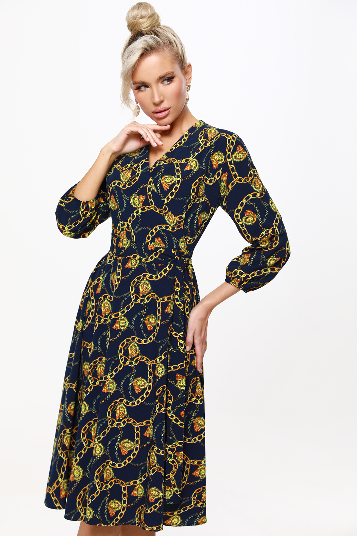 Темно-синее платье - универсальный выбор для любого времени года. Изготовлено из легкой и приятной на ощупь плательной ткани, оно обеспечивает комфорт при носке в любой сезон. Вид застёжки - молния, что делает процесс надевания и снятия платья быстрым и удобным. Вырез горловины в форме V добавляет изысканности и элегантности образу, при этом подчеркивая линию шеи. Модель платья - полуприлегающий силуэт, который выгодно подчеркивает формы, не слишком обтягивая фигуру. Тип рукава - 3/4, идеальный для повседневных деловых образов или вечерних выходов. Уход за платьем прост и удобен: его можно стирать в машине при температуре до 30 градусов, обеспечивая сохранение качества и цвета ткани на долгое время.