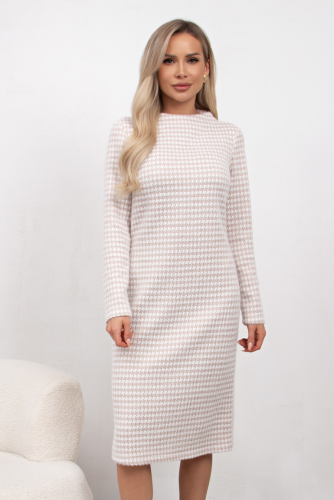 Комфортное платье прилегающего силуэта из трикотажного полотна. Длинные втачные рукава. Горловина оформлена воротником - хомут. Низ ровный, без разрезов. Модель без застежек. Практичное платье станет отличным дополнением к повседневному гардеробу.