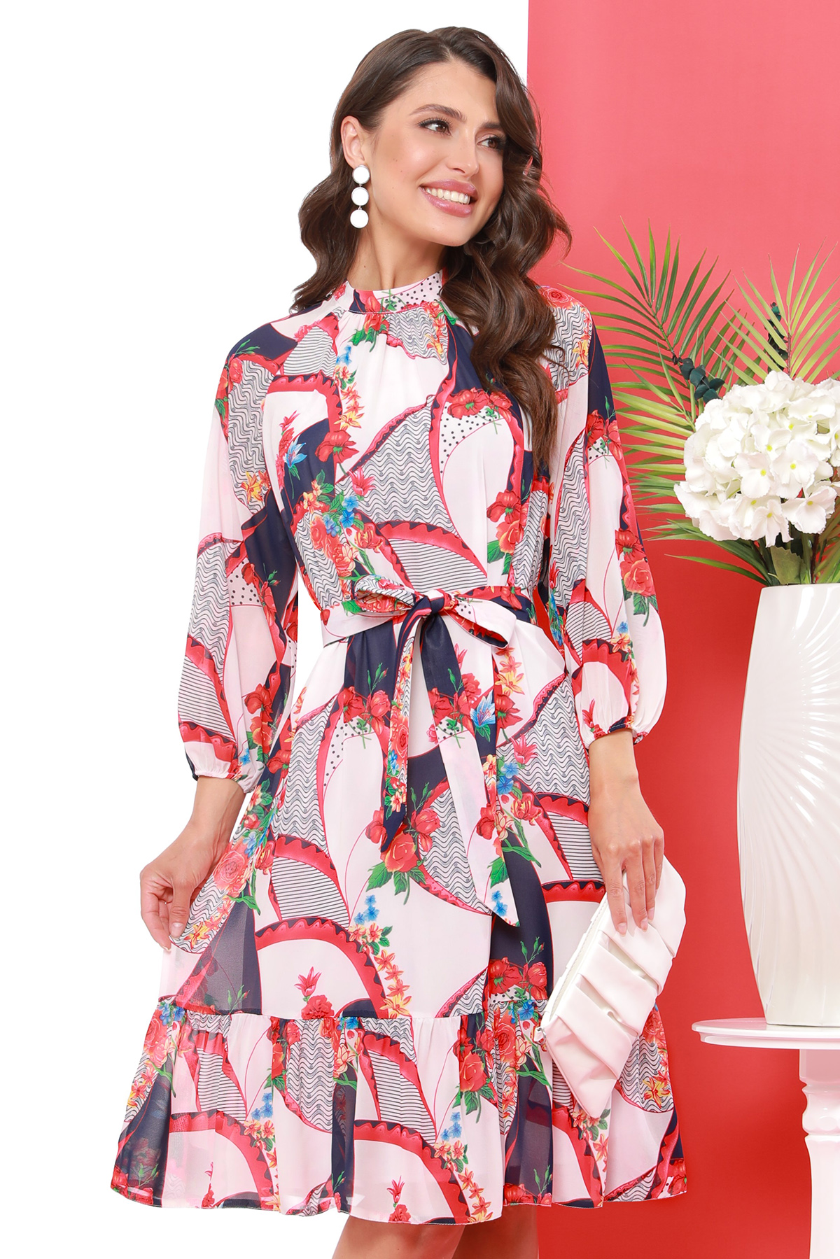 Воздушное платье из шифона с поясом — невероятно женственная модель, которая поможет составить роскошные образы на все случаи жизни. Фасон А-силуэта с воротником-стойкой, воланом по низу юбки и широкими рукавами эффектно струится при ходьбе, придает легкости и надежно скрывает любые недостатки в области рук, живота и бедер. Нежное платье всегда можно дополнить поясом из комплекта или подобрать более акцентный ремень, чтобы красиво подчеркнуть талию и приблизить фигуру к силуэту «песочные часы». Застежка-капелька на спинке утонченно завершает изделие. Шифоновая модель с подкладом не просвечивает и позволяет чувствовать себя уверенно. Невесомый, приятный к телу материал требует бережного ухода. Рекомендуется стирать платье в деликатном режиме при температуре до 30 градусов без отжима.