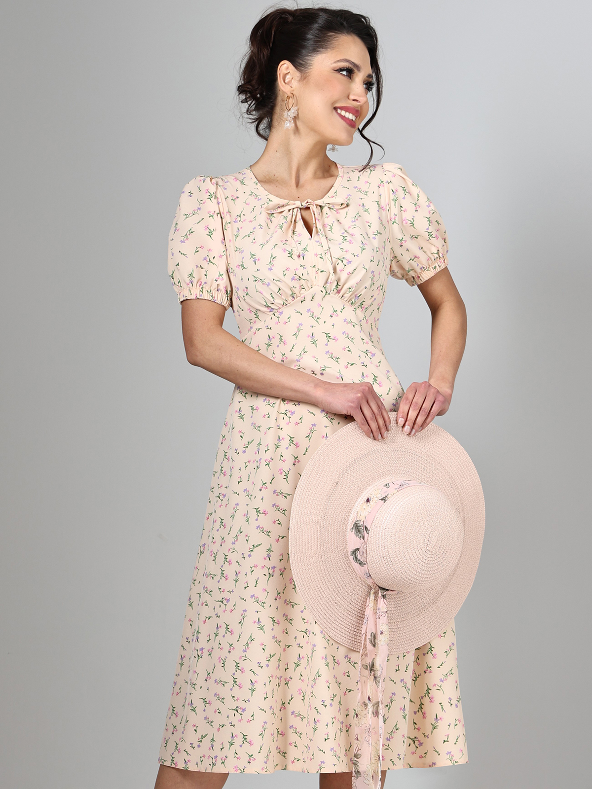 Это летнее платье с округлым вырезом на завязках и декоративной деталью в виде капли – прекрасный выбор для вашего гардероба на теплый сезон. Мягкая и легкая ткань обеспечивает приятное ощущение на коже, делая его идеальным вариантом для жарких дней. Короткие рукава на резинках добавляют платью легкости и свободы движения, позволяя вам чувствовать себя комфортно в любой обстановке. Расклешенная юбка создает воздушность и легкость образа, придавая ему женственный и игривый характер. Приталенный крой по фигуре подчеркивает естественные изгибы тела, помогая создать привлекательный и соблазнительный силуэт. Это платье подчеркнет вашу женственность и стиль, добавив нотку изыска и элегантности вашему образу. Надевайте это платье на свидания, прогулки или вечерние мероприятия, и вы будете выглядеть непревзойденно стильно и привлекательно в любой ситуации.