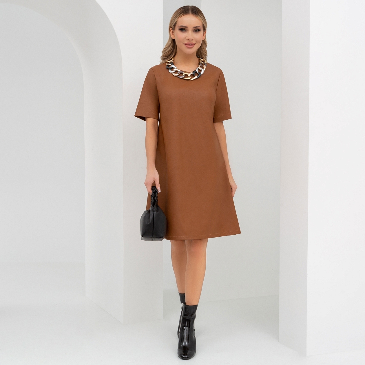 Вы готовы? Получить шедевр в вашу коллекцию. Уникальное платье, объединяющее лучшие тренды мировой моды 2025. Взгляните: экокожа и силуэт-трапеция. Оттенок Мокка, известный своей изысканностью и очарованием. Успевайте!