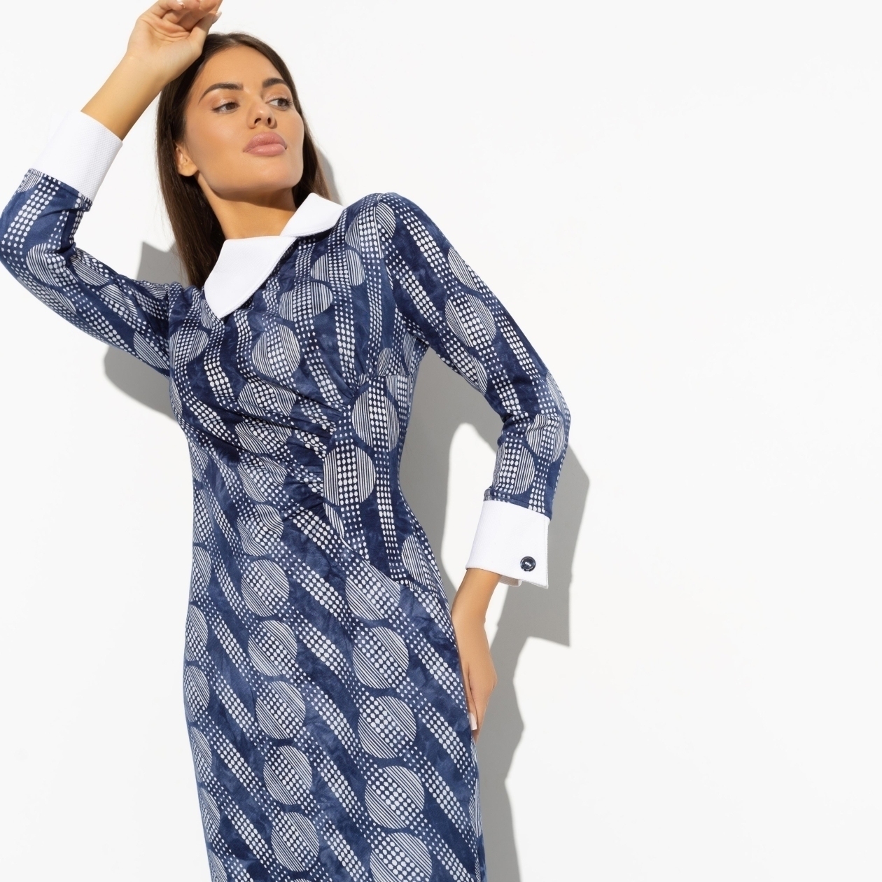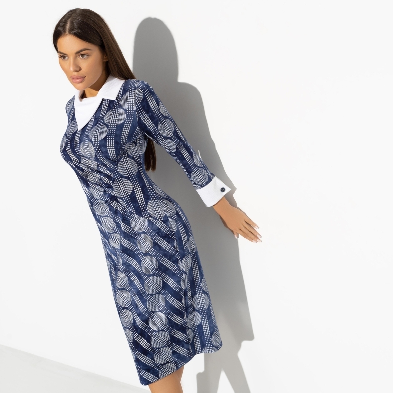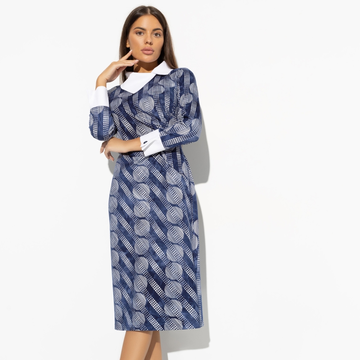 В день подписания важного контракта важно выглядеть собранно, но показать свое намерение на успешный исход. Платье в притягательных голубых оттенок со строгим воротничком создано для важных дней. Платье в длине миди по фигуре. Небольшой разрез сзади.