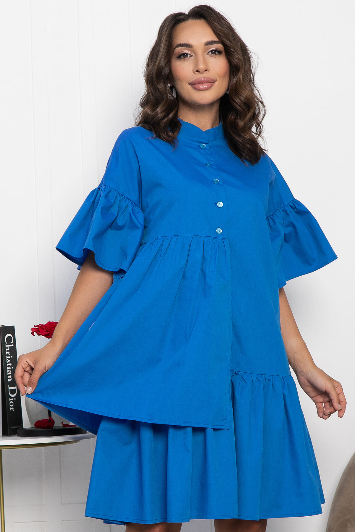 Ассиметричное воздушное платье в светло-лиловом цвете свободного силуэта. На правой полочке и левой половинке спинки – подрез, расположенный выше линии талии. В шов подреза вставлена декоративная отлетная оборка, переходящая с полочки на спинку. По полочке — центральная бортовая застежка на петли и пуговицы. Воротник – стойка. Линия плеча спущена. К пройме пришита широкая воздушная оборка. По низу платья по кругу проходит воздушная широкая оборка.