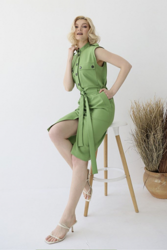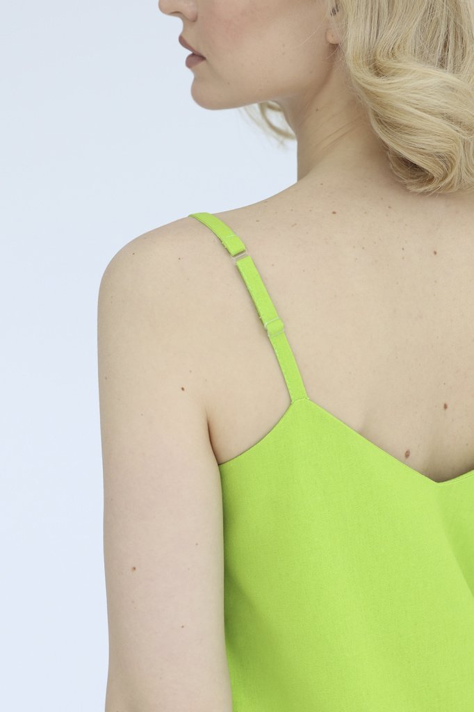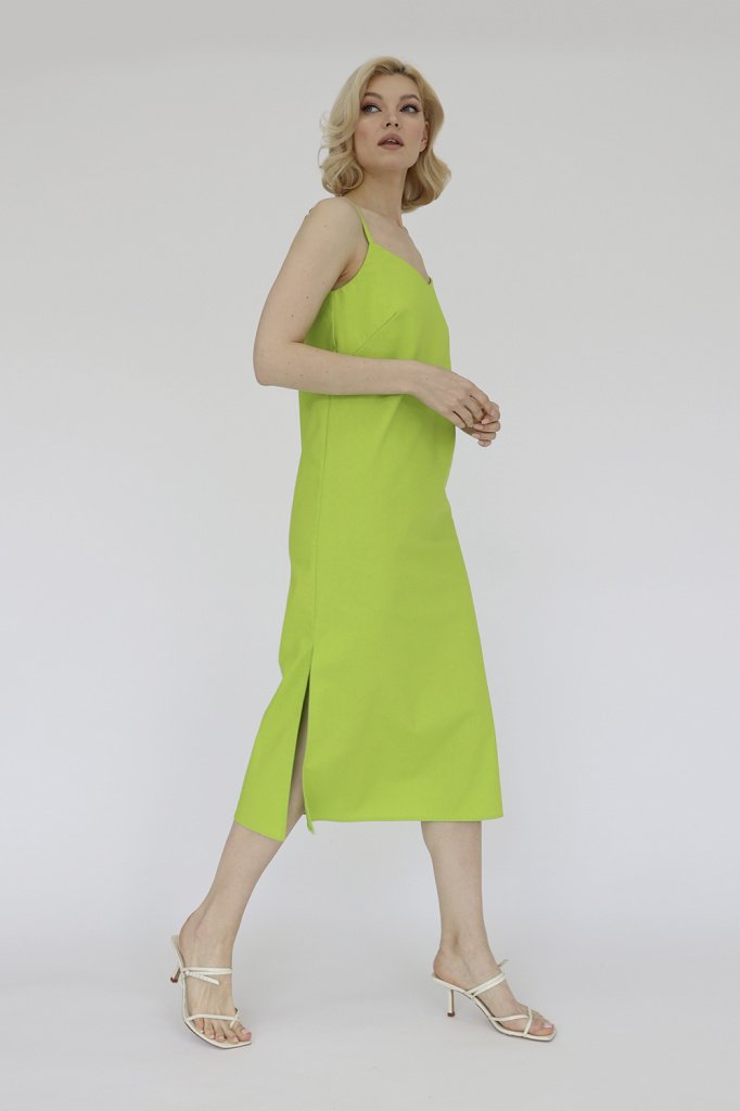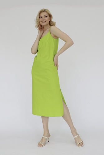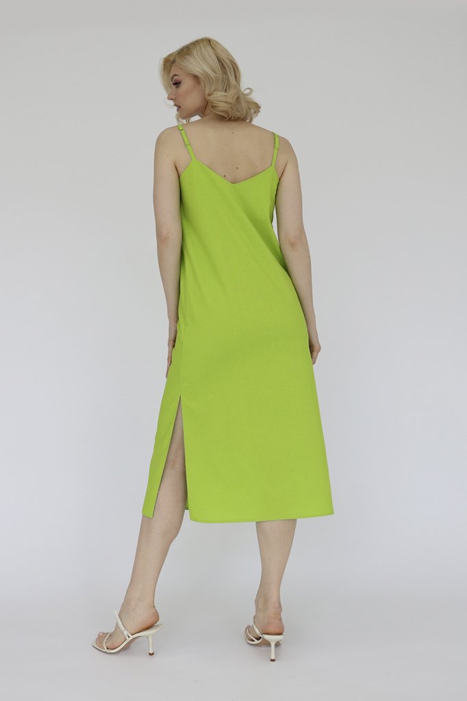 V-вырез по переду и спинке, регулируемые по длине бретели, боковые разрезы в швах.