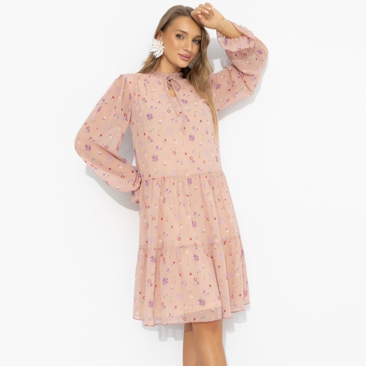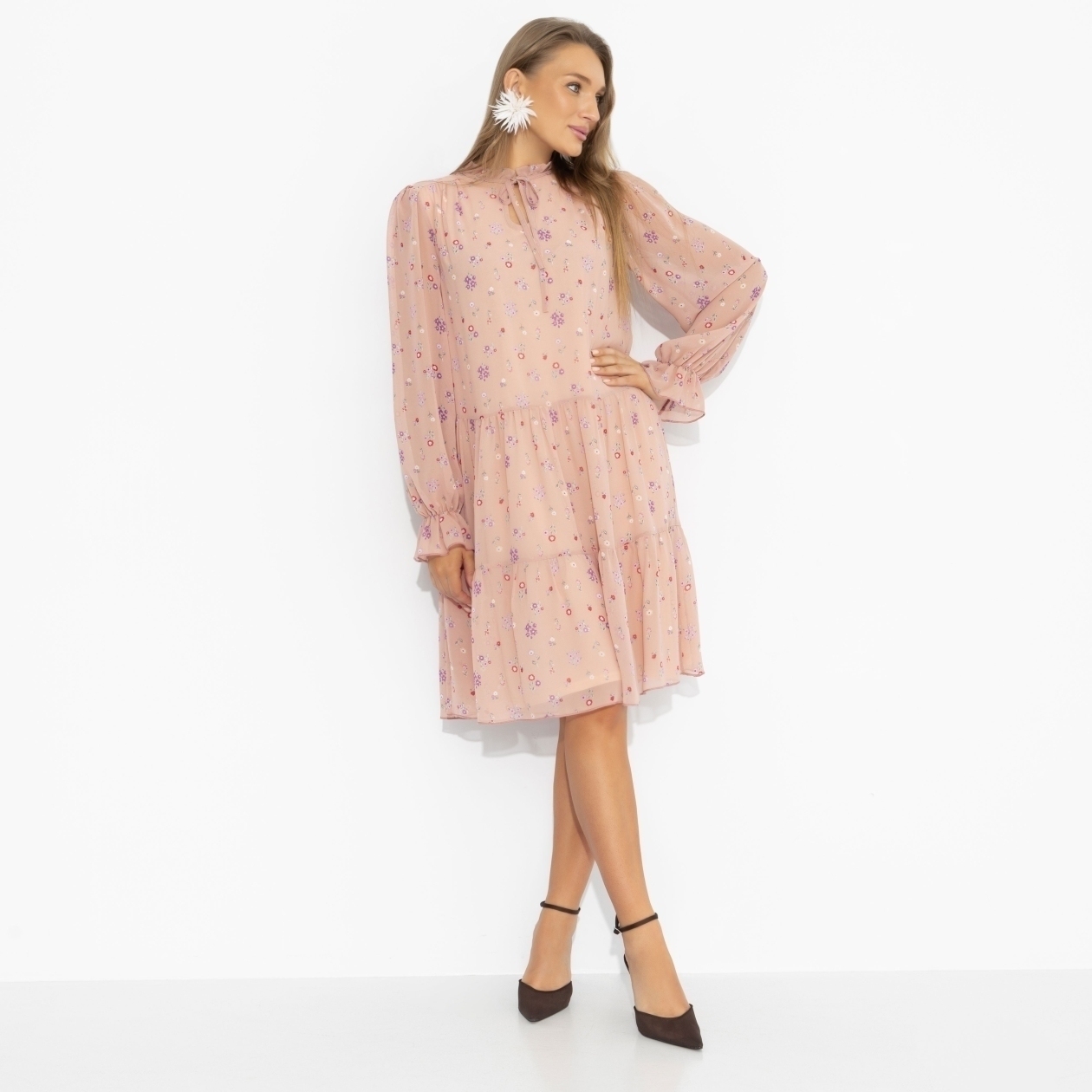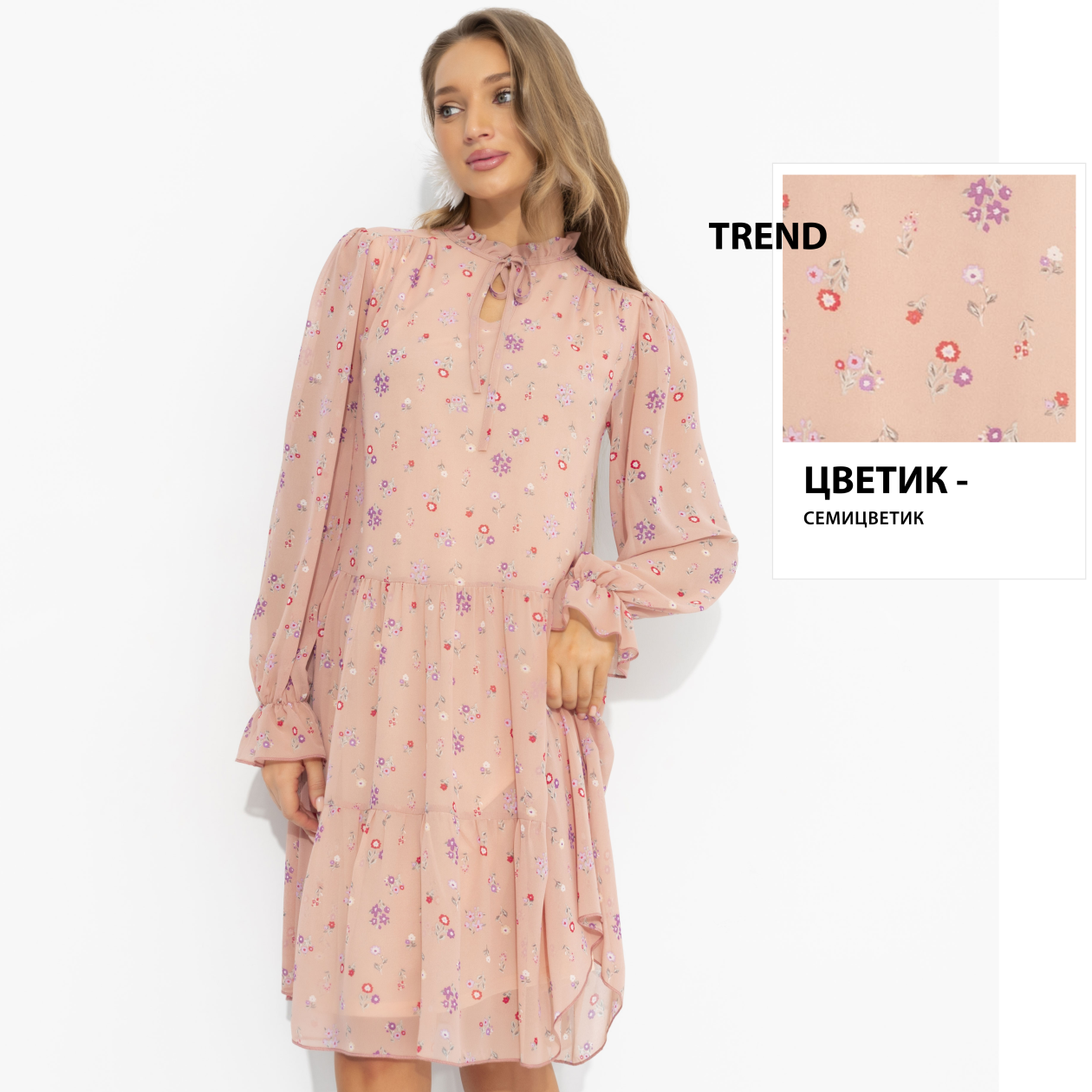 Оттенок твоего нового платья – как закат в конце тёплого дня: пудрово-розовый с мягкими цветочными вкраплениями звучит деликатно и притягательно. Стихия образа – воздух с примесью воды: лёгкость, текучесть, нежность без наивности. Полупрозрачная фактура и воздушные рукава создают движение при каждом шаге. Платье не требует усилий – но волшебным образом усиливает твои природные черты. И да, поразительно красива здесь именно ты! Платье на подкладе.