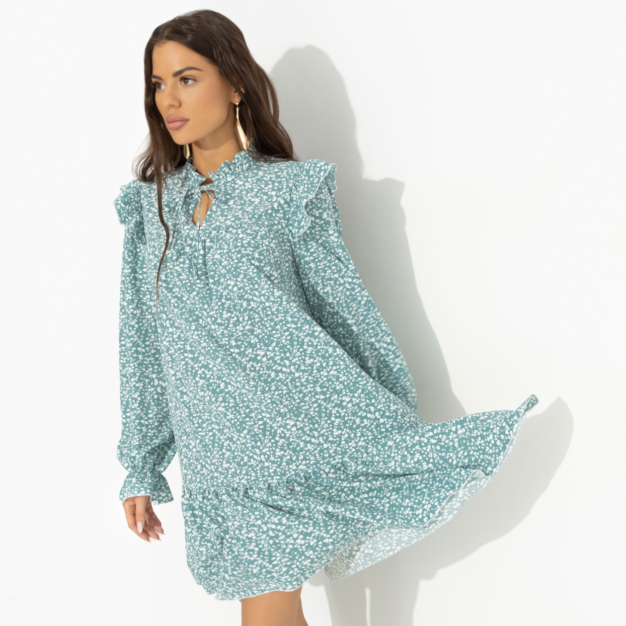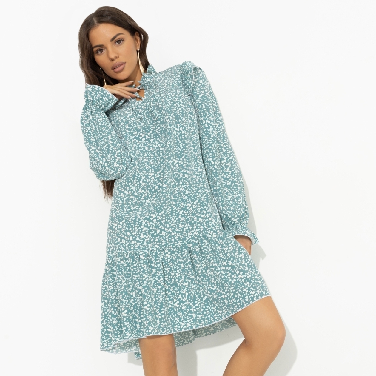 Настроение дня – надеть платье CHARUTTI. Несмотря на то, что сегодня нужно съездить в автосервис и отвезти ребенка на спортивную секцию. Любые дела приятнее делать, когда ты роскошна. Платье в длине до колена. Свободный силуэт изделия. Объемный декор в виде рюш на плечах и подоле изделия. Воротник-стойка дополнен завязками.