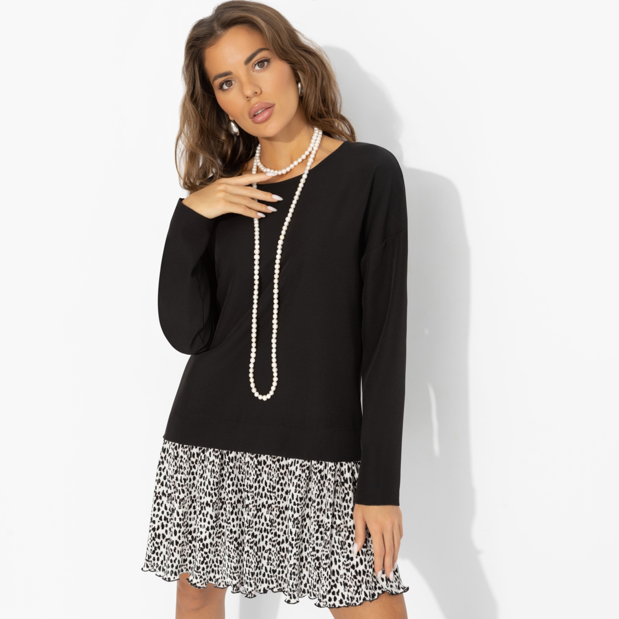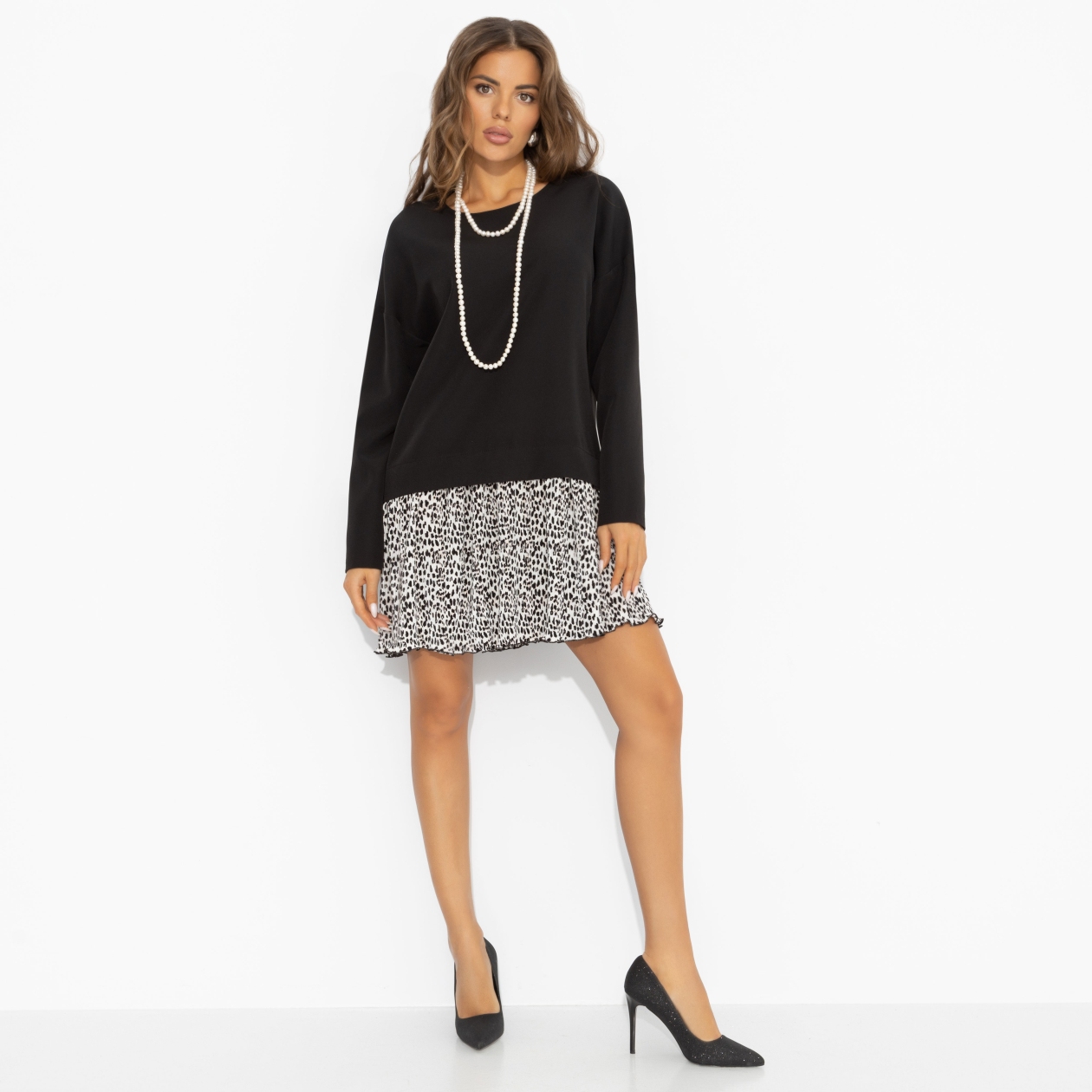 Это платье умеет отматывать время: контрастный верх и летящая гофрированная юбка создают самый юный и беззаботный образ. Ты как будто только что после пар вышла на прогулку с одногруппницами. Свободный крой, игривое мини и динамичный принт на юбке визуально освежают и делают лук супер-молодым – без фильтров и ретуши. Верх из костюмной ткани держит форму и делает силуэт аккуратным, а плиссированная юбка из трикотажа «гофре» добавляет движению лёгкости. Платье легко стилизовать кедами или ботильонами, но в любом варианте оно подчёркивает вашу нежность.