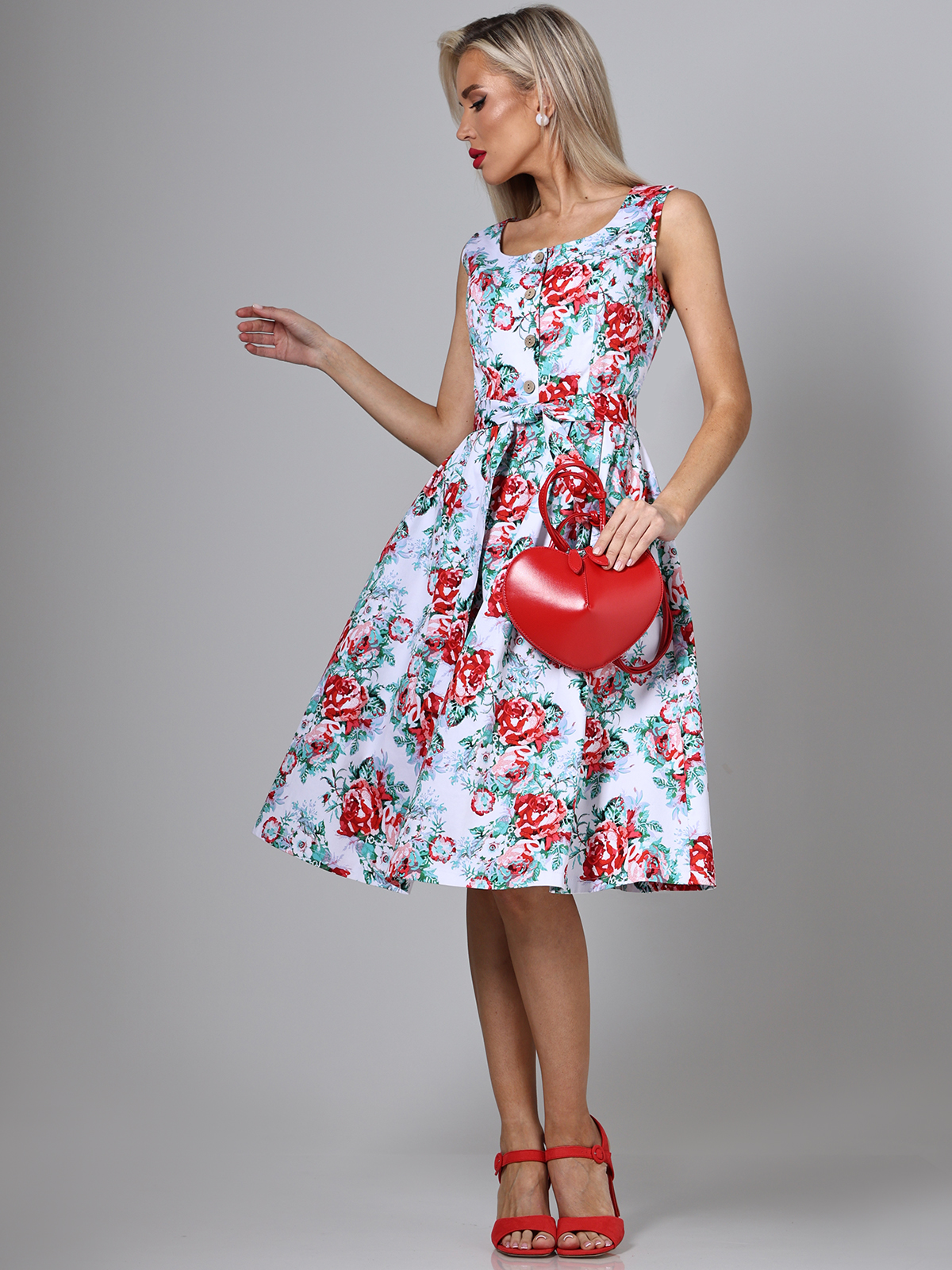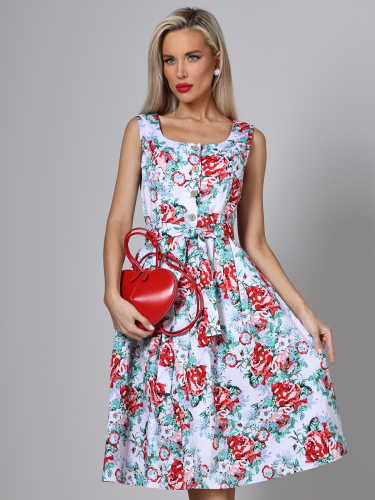 Летнее платье-сарафан с цветочным принтом выполнено из сатина — легкой и приятной к телу ткани. Прилегающий верх с рельефным кроем на груди и застежкой на молнию подчеркивает расклешенность юбки и все это создает вечно актуальный силуэт нью-лук, женственный и элегантный. В комплекте к платью прилагается пояс.Модель подходит для повседневной носки, а также для офиса. Платье представлено в больших размерах, что делает его универсальным выбором для разных типов фигур. Уход за изделием прост: рекомендуется бережная стирка при температуре 30 градусов. Цветочный принт добавляет образу легкости и свежести, делая платье стильным вариантом для летнего сезона.