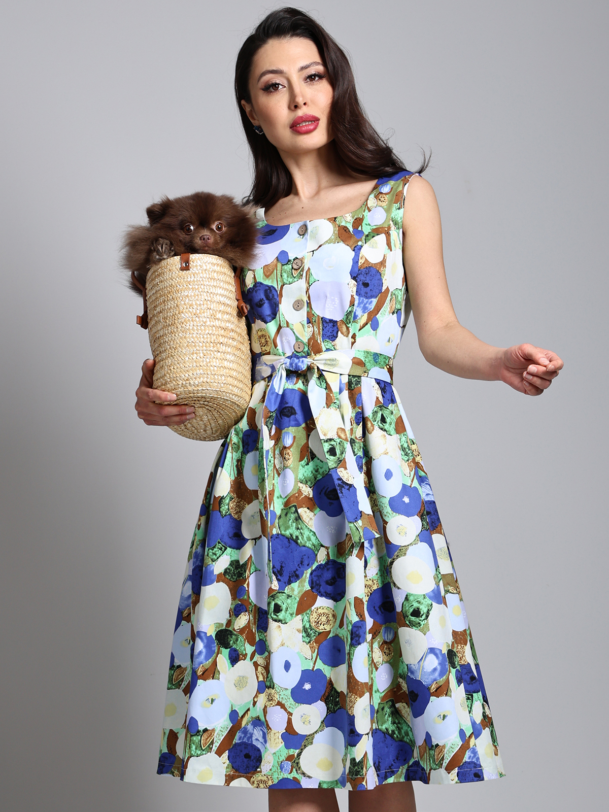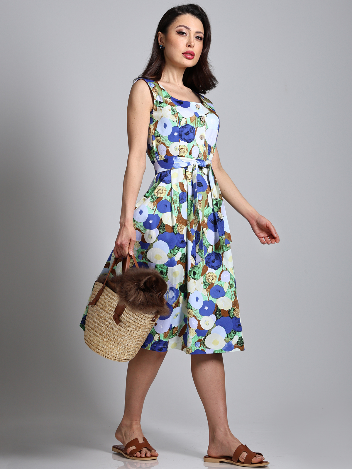Летнее платье-сарафан с цветочным принтом выполнено из сатина — легкой и приятной к телу ткани. Прилегающий верх с рельефным кроем на груди и застежкой на молнию подчеркивает расклешенность юбки и все это создает вечно актуальный силуэт нью-лук, женственный и элегантный. В комплекте к платью прилагается пояс.Модель подходит для повседневной носки, а также для офиса. Платье представлено в больших размерах, что делает его универсальным выбором для разных типов фигур. Уход за изделием прост: рекомендуется бережная стирка при температуре 30 градусов. Цветочный принт добавляет образу легкости и свежести, делая платье стильным вариантом для летнего сезона.
