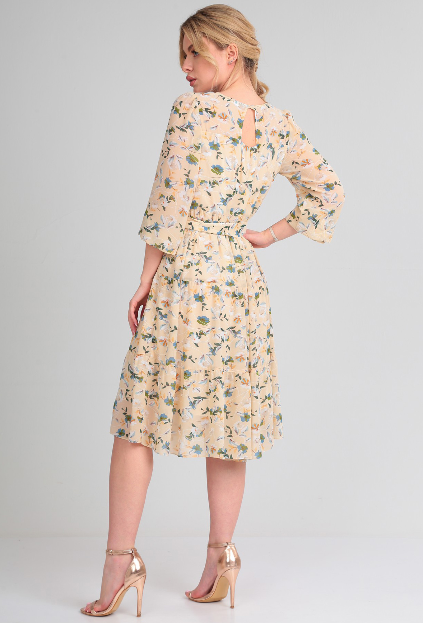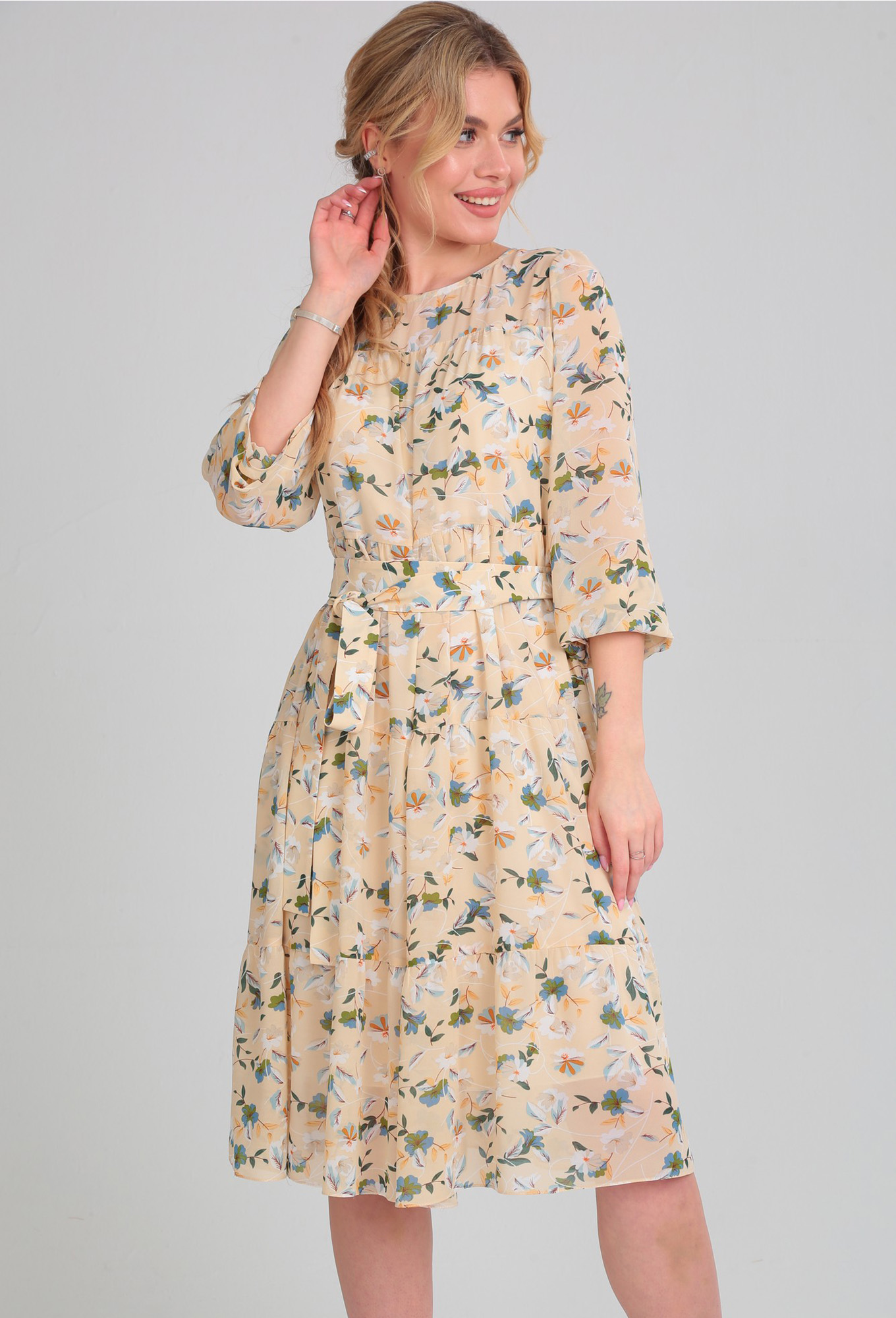 Модель: Верита 2202 бежевый цветы ..показать>Рост: 164 см (девушка на фото ростом 170см) Сезон: Весна-Лето Тип ткани: Полиэстер 100%Платье выполнено из легкой, струящейся шифоновой ткани, на подкладке. Платье А-обратного силуэта. По переду и спинке отрезная кокетка. Вырез горловины круглый. По спинке застежка на пуговицу. Платье состоят из воланов. Пояс из основной ткани. Рукав длинный, по низу есть сборка.