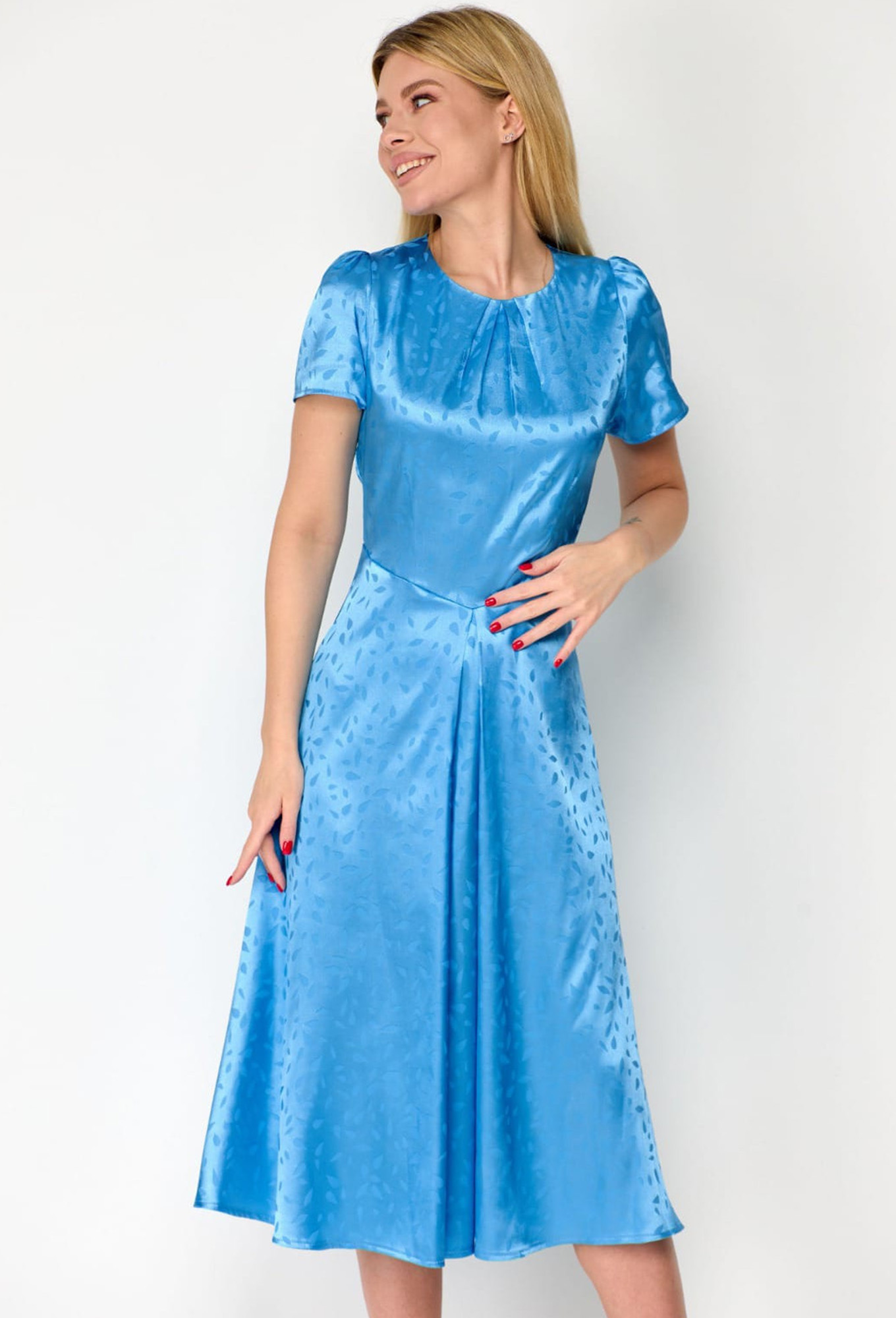 Модель: Виола Стайл 01048 голубой ..показать>Рост: 164 см (рост модели на фото 170см) Сезон: Весна-Лето Тип ткани: Полиэстер 94%, спандекс 6%Платье женское, отрезное по линии талии с втачными короткими рукавами. По окату рукава обработано сборка. По переду обработаны талиевые вытачки и декоративные складки по горловине. Нижняя часть платья расширенная, по переду заложено широкая встречная складка. Спинка со средним швом в котором обработана потайная тесьма молния И таливые вытачки по спинке. Горловина обточная, низ рукавов и платья подогнут и закреплён отделочной строчкой.
