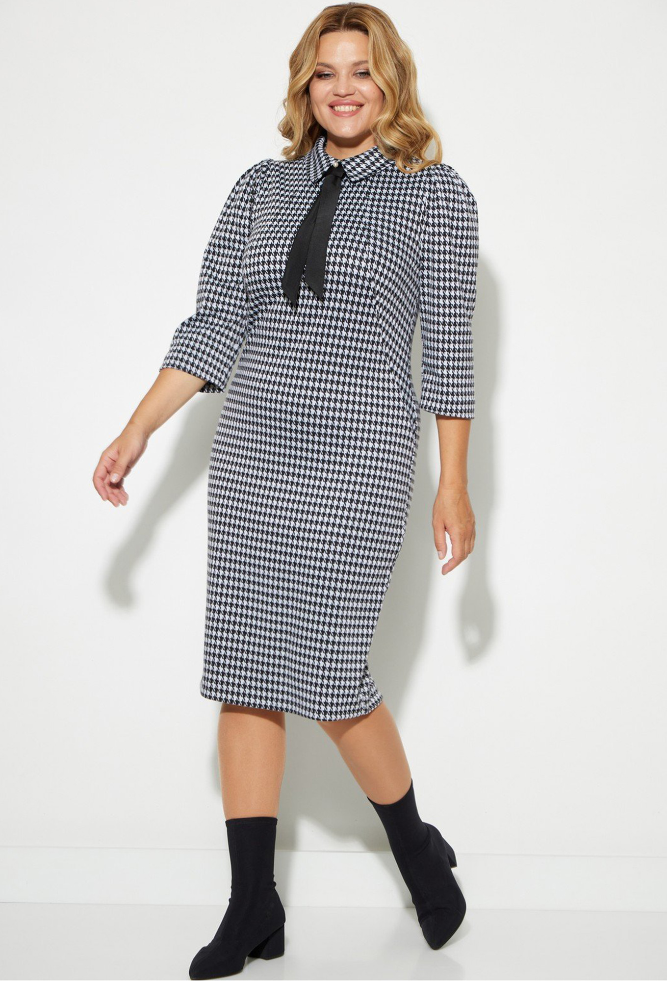 Модель: Виола Стайл 01061 черно-белый лапк..показатьа Рост: 164 см (рост модели на фото 170см) Сезон: Круглогодичный Тип ткани: ПЭ 74%,Вискоза 22%,Спандекс 4%Платье женское прилегающего силуэта. Из трикотажного полотна, по переду обработан рельеф,  идущий от горловины через центр груди и уходящий в боковой шов. Спинка со средним швом в котором обработан разрез и потайная тесьма-молния. Спинка с талиевыми вытачками. Горловина обработана воротником-стойкой. Стойка застёгивается сзади на две воздушные петли и пуговицы. Рукав широкий вверху и заложен складками по окату, а также заужен внизу. Платье зауженное к низу, за колено. В комплекте идёт декоративный галстук.