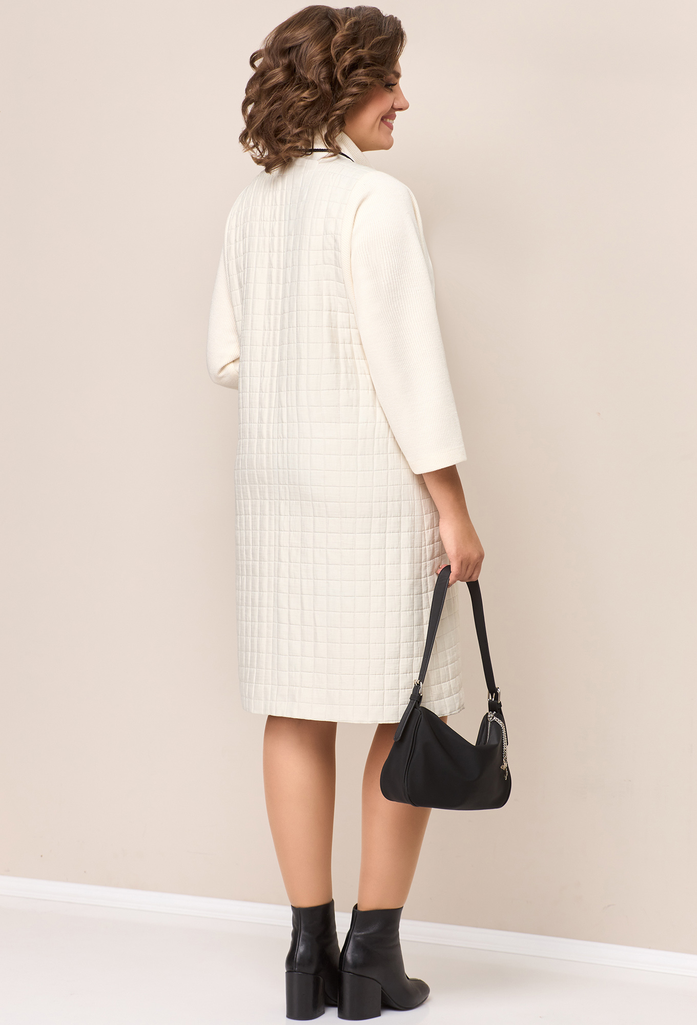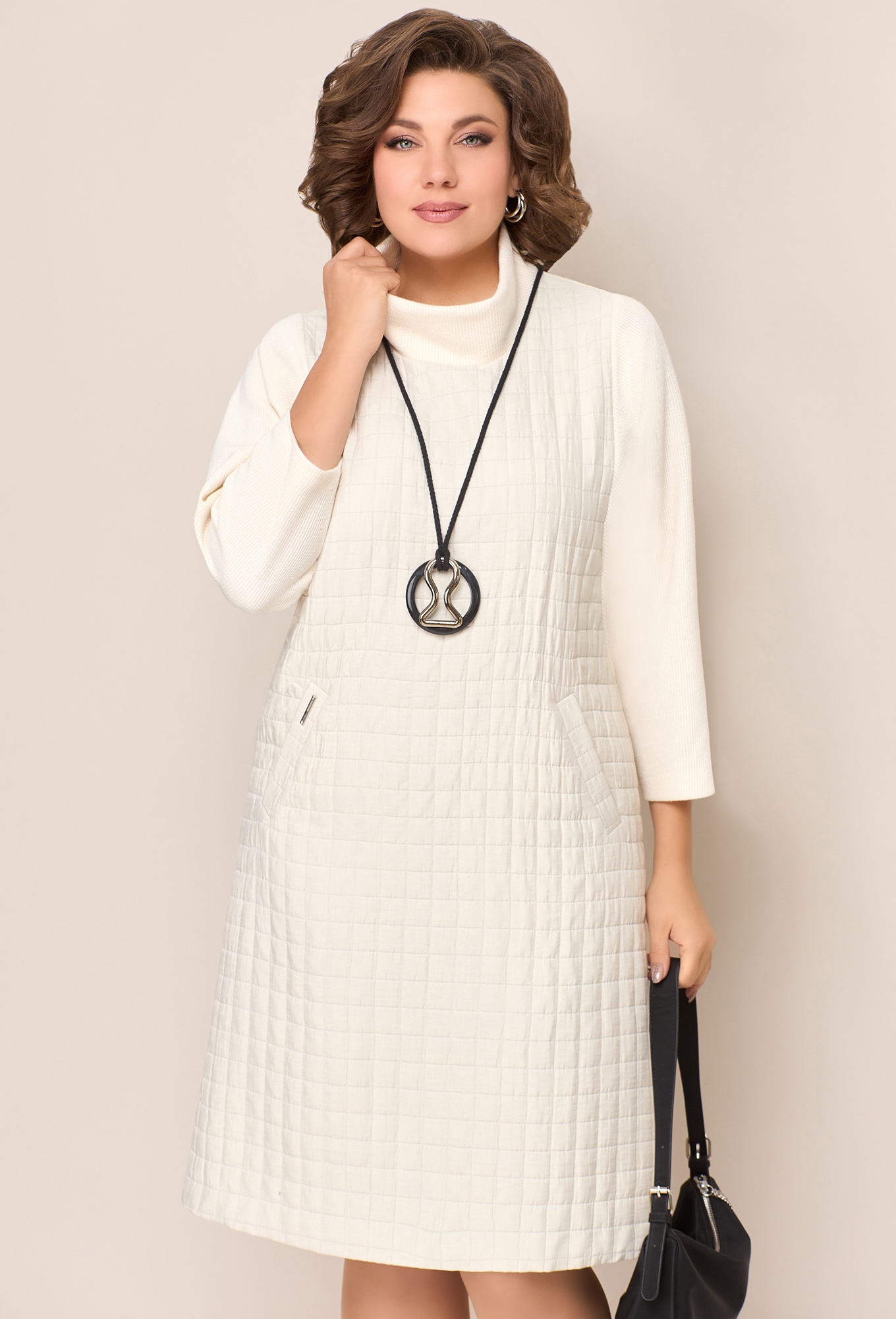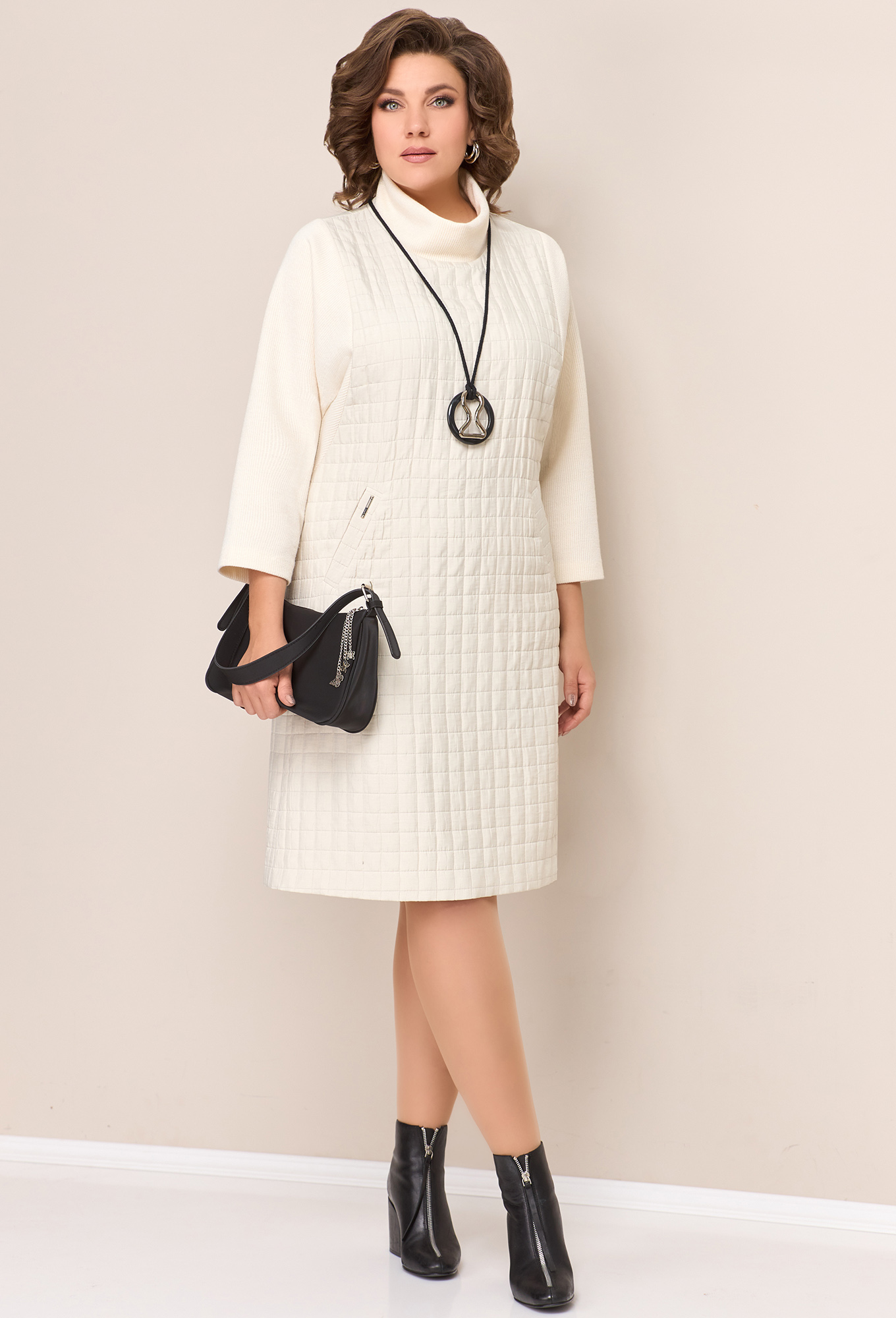 Модель: Волна 1324 молочный Рост:..показать 164 см (девушка на фото ростом 170см) Сезон: Осень-Зима Тип ткани: Полиэстер 78%, вискоза 22%Комбинированное платье из стеганого текстиля и фактурного трикотажа с горловиной мягкая стойка. Силуэт платья - легкая трапеция, полуприлегающий. Рукав 7/8. Длина платья- 102 см по центру спинки.