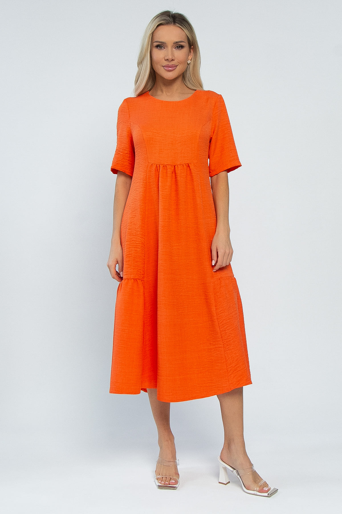Платье свободного кроя средней длины — это прекрасный выбор для создания стильного и комфортного летнего образа! Его округлая горловина и втачные рукава средней длины придают платью изысканность. Платье расширяется к низу от линии груди, создавая нежный и воздушный силуэт. Декоративные элементы в виде сборок по бокам и чуть ниже линии груди спереди и сзади придают ему неповторимую изюминку. Это платье станет настоящим украшением вашего гардероба!