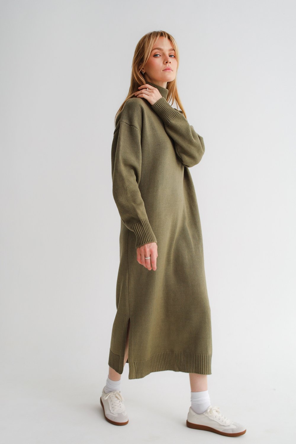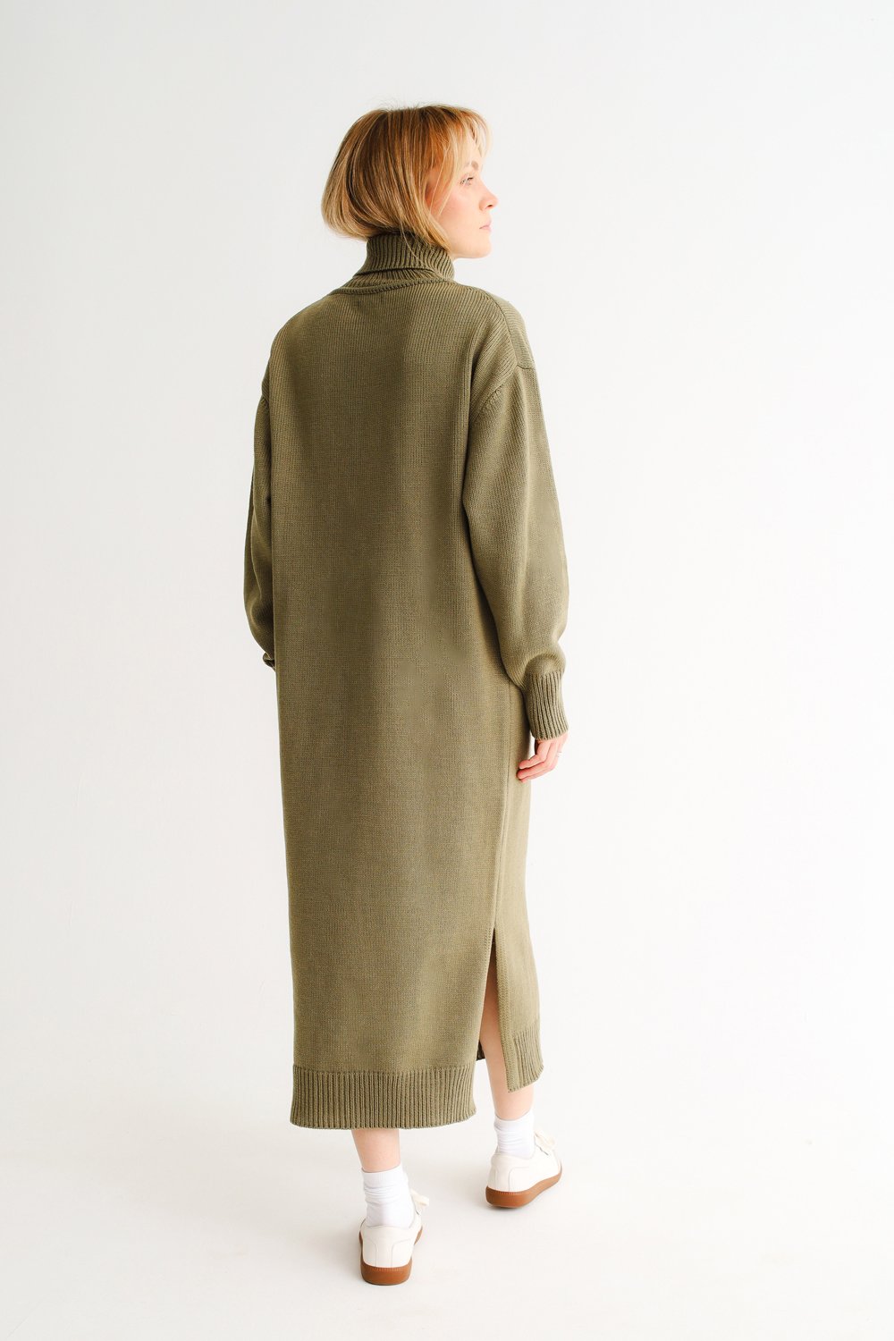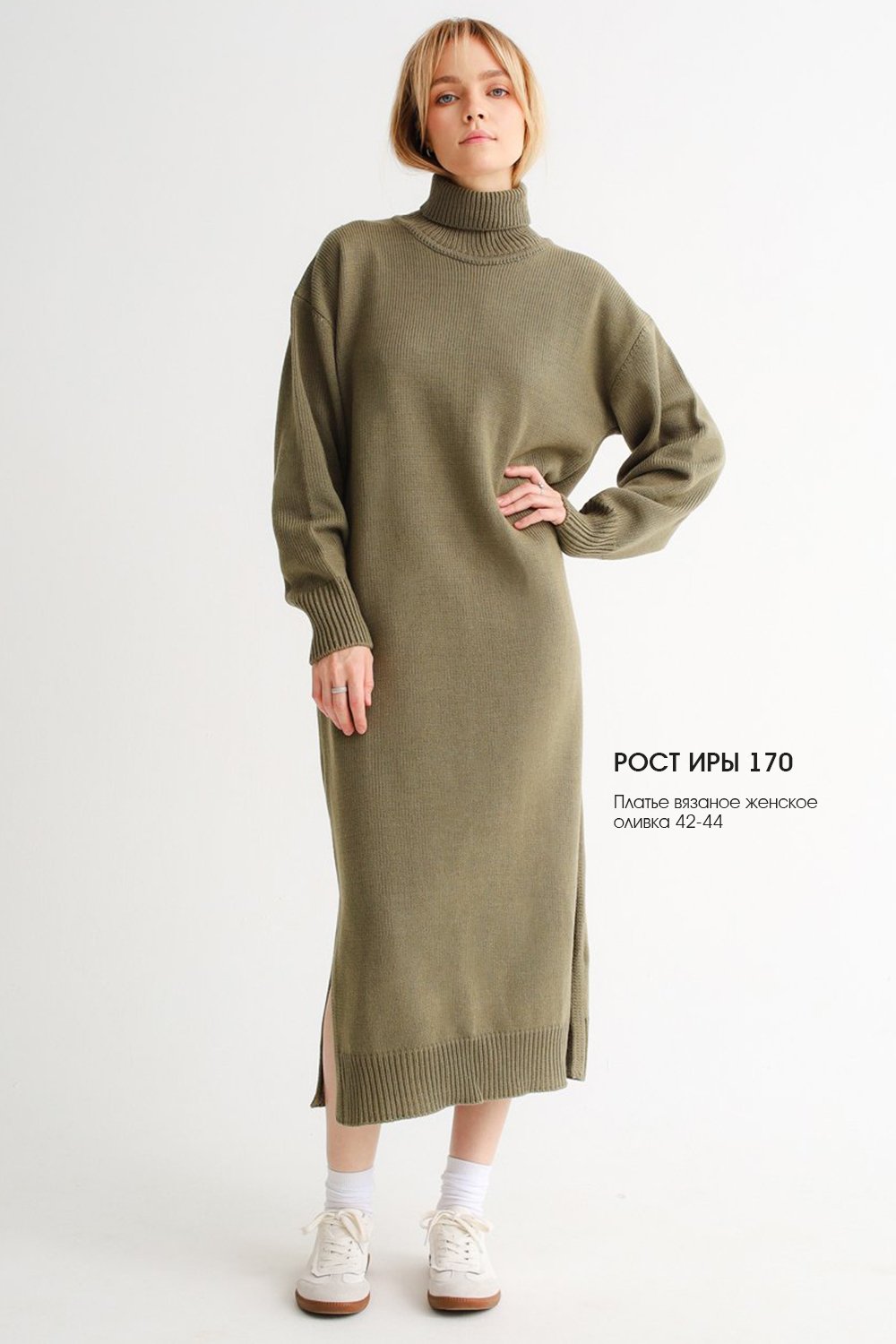 Платье силуэта over-size с высоким воротником с отворотом. Длина макси. Разрезы по низу изделия по бокам. Длинные рукава с манжетами. Пряжа класса премиум.