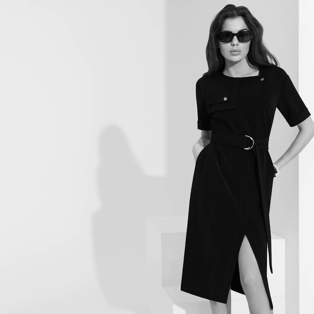 Королевский образ с классическим черным. Платье с акцентным поясом и трендовым разрезом. Четкий крой отлично структурирует фигуру. Подходит для офиса и повседневного стиля.