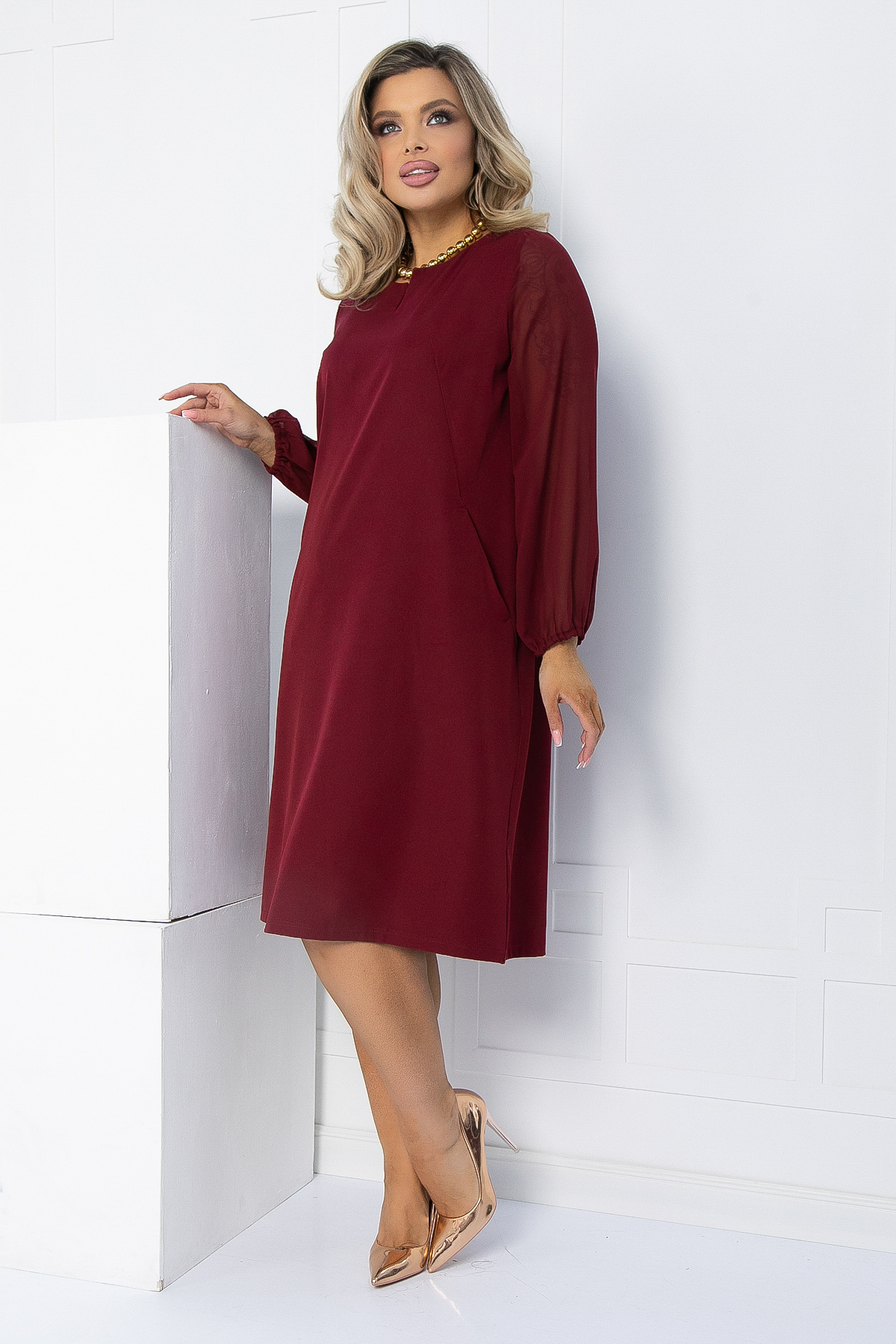 Платье имеет свободный крой, что обеспечивает удобство и свободу движений. Длинные шифоновые рукава придают образу легкость и утонченность. Округлый фигурный вырез подчеркивает линию шеи и декольте, создавая романтический акцент. Дополните образ аксессуарами и обувью на каблуке, чтобы завершить его.