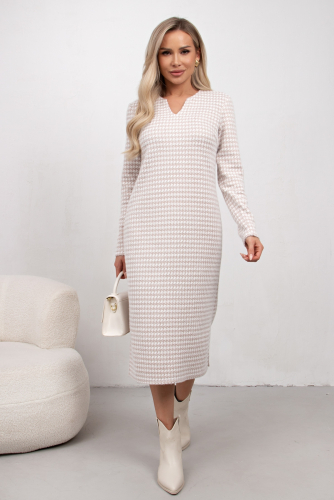 Комфортное платье прямого силуэта выполнено из трикотажного полотна Ангора. Горловина оформлена цельнокроеной стойкой - лодочка. Длинный втачной рукав. Низ ровный, без разрезов.