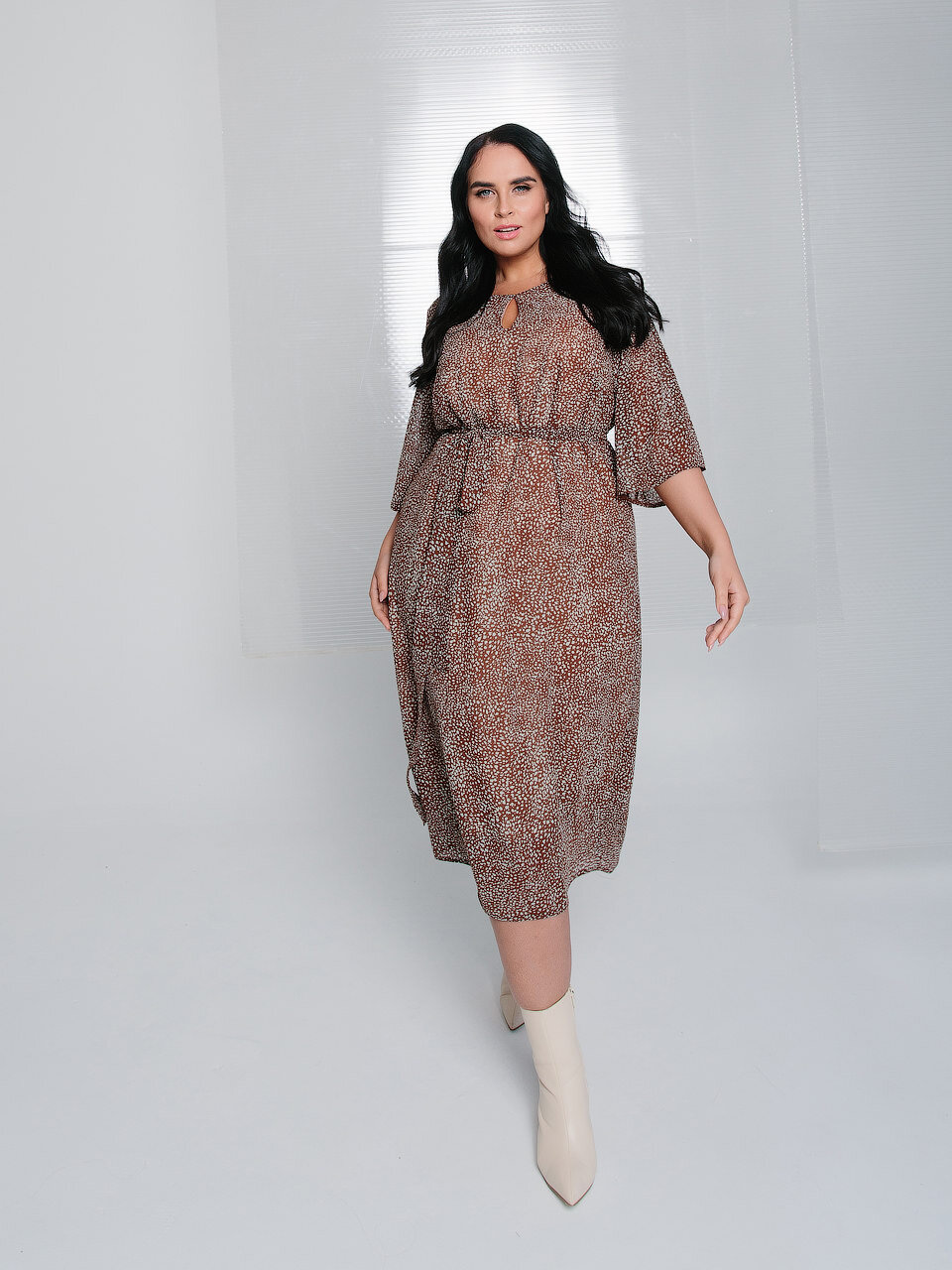 Состав: 100% полиэстер. Ткань: шифон. Цвет: коричневый/принт. Горловина: овальная с вырезом-капелька по переду. Спинка со средним швом, подклад переда и спинки, вытачки на выпуклость груди из проймы. Параметры модели на первых фото: ОГ105/ОТ85/ОБ115. Рост модели 174 см. Размер изделия на модели 54. Параметры модели на последних фото: ОГ115/ОТ101/ОБ139. Рост модели 178 см. Размер изделия на модели 64.