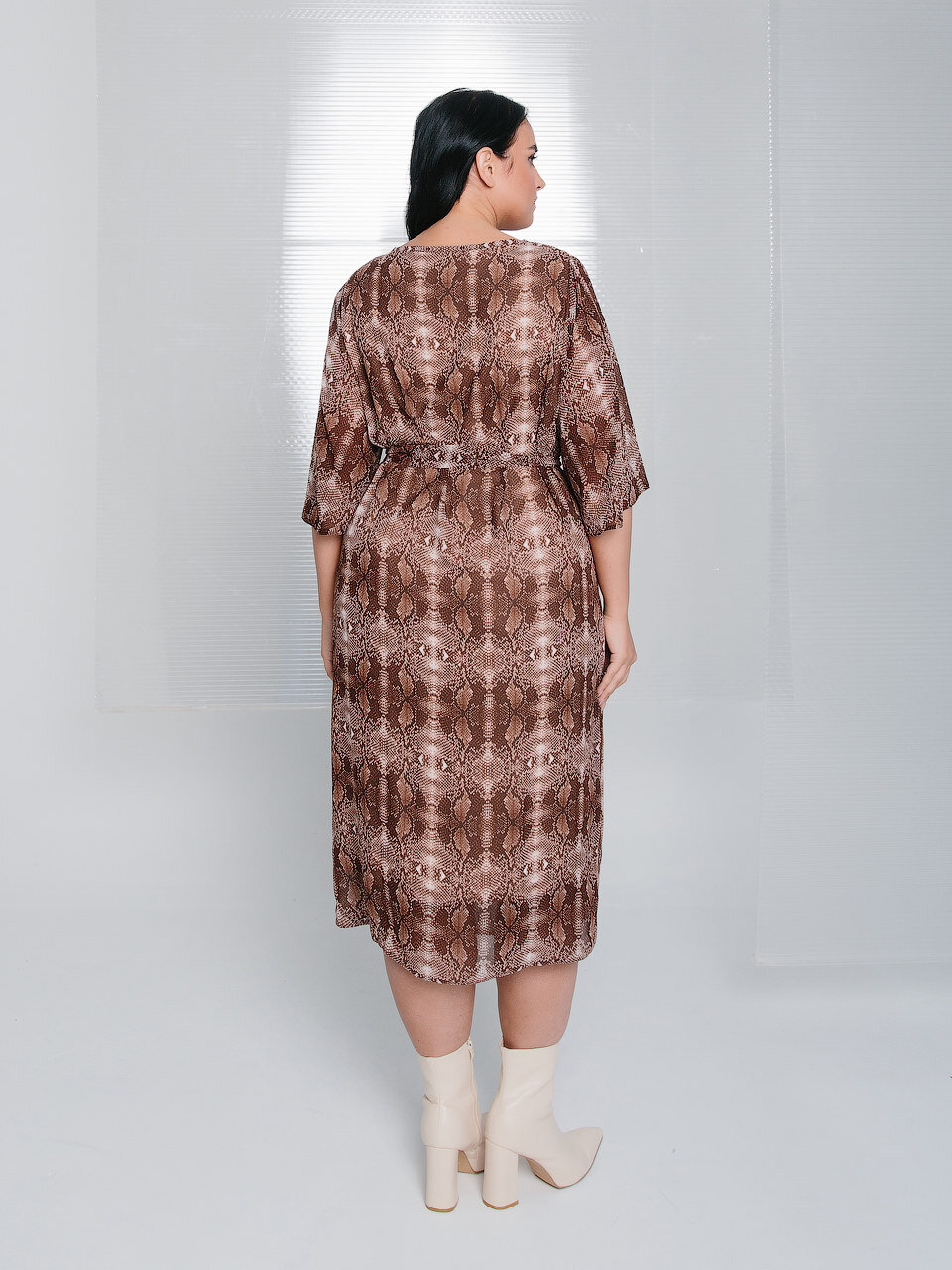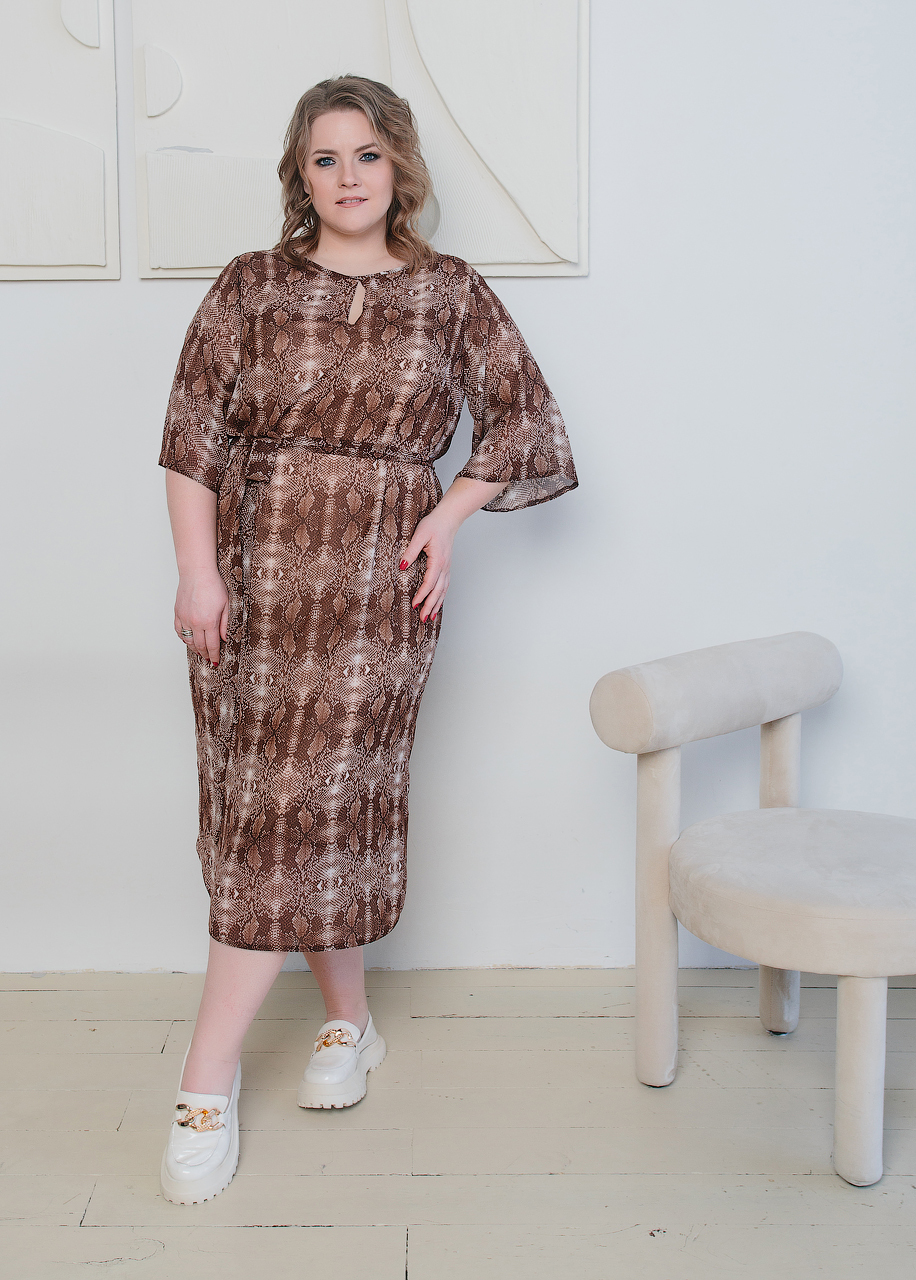 Состав: 100% полиэстер. Ткань: шифон. Цвет: коричневый/питон. Горловина: овальная с вырезом-капелька по переду. Спинка со средним швом, подклад переда и спинки, вытачки на выпуклость груди из проймы. Параметры модели: ОГ105/ОТ85/ОБ115. Рост модели 174 см. Размер изделия на модели 54.