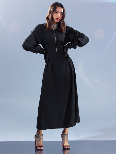 Текстильное платье мини женское полуприлегающего силуэта с фигурным низом. Перед с центральной застежкой на пуговицы. Горловина круглой формы с воротником-стойкой. Спереди и сзади заложены складки, подчеркивающие талию. Линия плеча спущена, длинные рукава заканчиваются широкими манжетами.