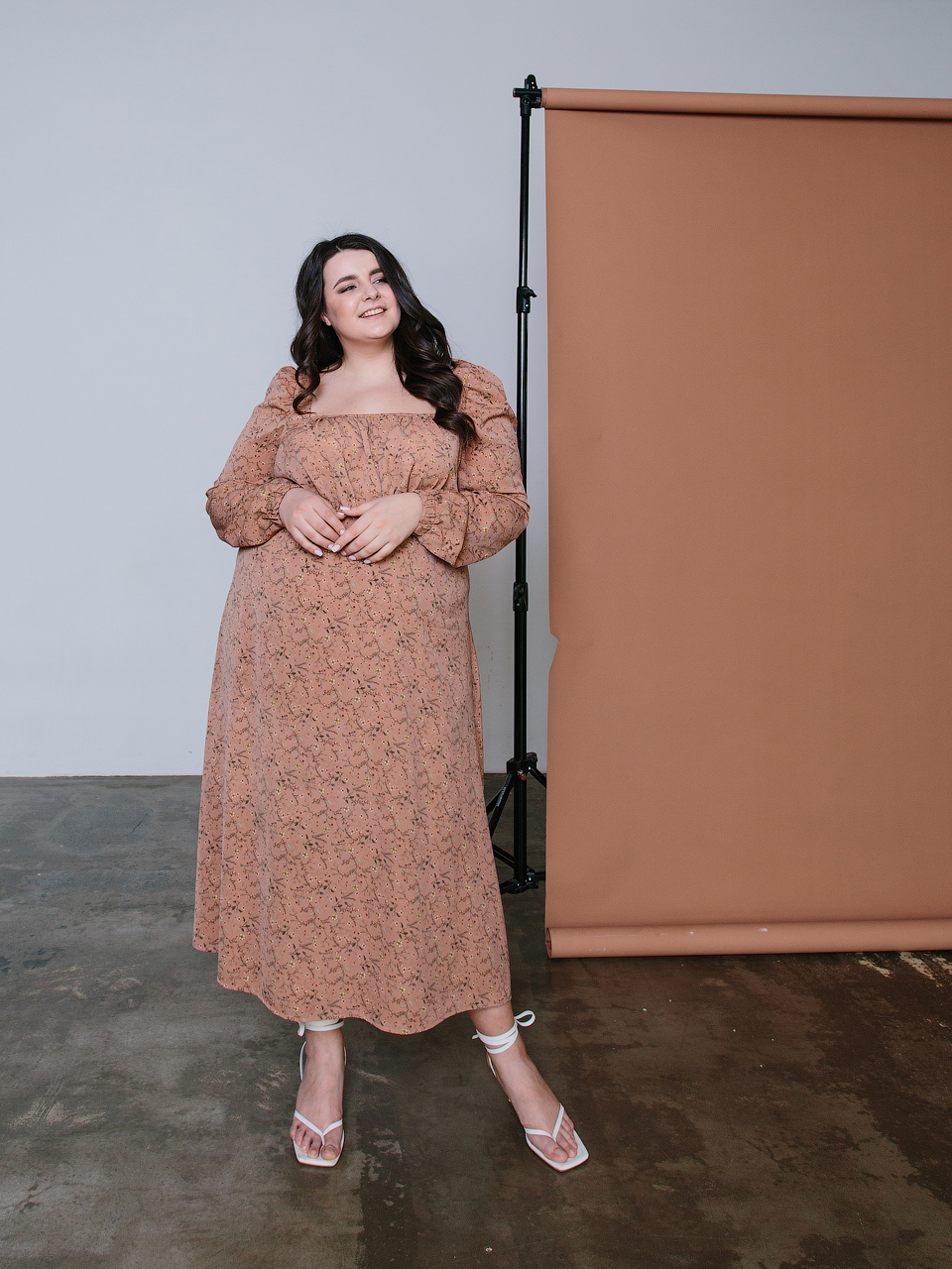Состав: 55% вискоза, 40% полиэстер, 5% эластан. Ткань: шелк прадо. Цвет: бежевый. Фактура: гладкая. Покрой: приталенный. Без подклада. Длина ниже колена. Рукав втачной одношевный длинный, на широкой манжетой. Вырез карэ по переду и спинке, обтачан обтачкой. Сборка верхней части переда по срезу горловины и по линии талии. Сборка по окату рукава. Параметры модели:ОГ115/ОТ101/ОБ139. Рост модели 178 см. Размер изделия на модели 64
