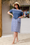 Платье женское полуприлегающего силуэта, слегка расширенное к низу. Кокетка полочки переходит в короткий цельнокроенный рукав, по шву притачивания кокетки к полочке кокетка присборена. Нижняя часть платья из отделочной ткани, сбоку разрезы. На полочке с каждой стороны по два накладных кармана, наложенных и смещенных друг относительно друга из основной ткани и ткани - компаньона. Все карманы функциональны. Свободный покрой и сочетание полосы с отделочной тканью придают платью достаточную комфортность и актуальность.
