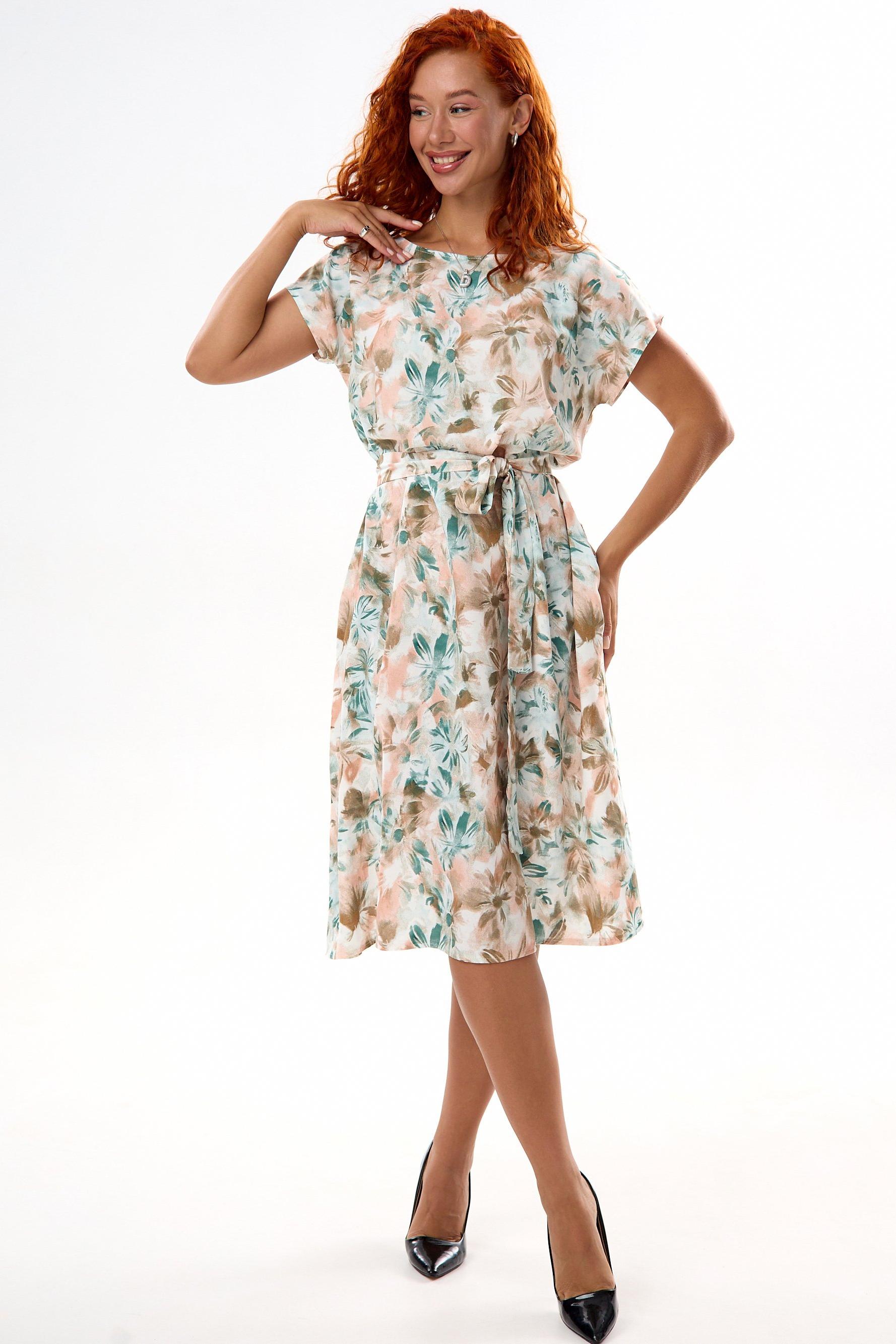 Элегантное штапельное платье длины миди. Платье свободного покроя с широким поясом на талии. Рукав короткий, цельнокроеный. При ходьбе подол красиво струится. Яркости платью придаёт цветочный принт на ткани. В таком платье можно пойти на работу, а если дополнить аксессуарами, то получится вечерний образ.