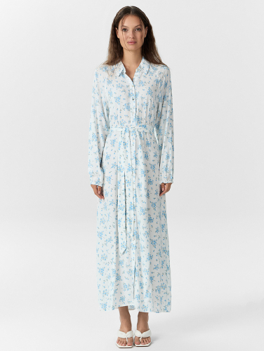 Женское платье-рубашка с цветочным принтом — это воплощение легкости и женственности в элегантном повседневном образе. Миди-длина придает модели утонченность, делая ее подходящей как для прогулок, так и для неформальных встреч. Застежка на пуговицы по всей длине обеспечивает удобство и позволяет регулировать степень открытости — от классического до более расслабленного варианта. Отложной воротник добавляет структурности, а длинные рукава с деликатной сборкой подчеркивают романтический характер образа. Тканый пояс акцентирует талию и придает силуэту легкую выразительность. Вискозная ткань дарит коже мягкость и комфорт, красиво струится и подчеркивает женственные линии. Такое платье можно дополнить сандалиями, балетками или даже кедами — и каждый раз оно будет звучать по-новому.