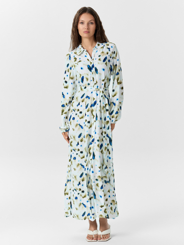 Геометрический принт на нежном молочном фоне создает визуальную глубину и легко сочетается с аксессуарами в базовой палитре. Платье подходит для офиса, встреч или повседневных выходов.