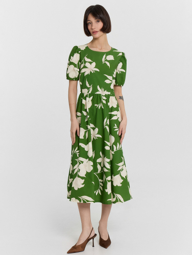 Летнее женское платье миди — воплощение легкости и элегантности! Приталенный крой подчеркивает фигуру, создавая женственный силуэт, а расширенная книзу юбка добавляет воздушность и свободу движений. Короткие рукава-фонарики придают образу романтичность и утонченность, а округлый вырез подчеркивает нежность линии шеи. Эластичная сборка на талии на спинке обеспечивает комфортную посадку, мягко моделируя силуэт, а аккуратная застежка на пуговицах на спинке добавляет стильный акцент. Натуральный хлопок делает платье идеальным для жаркого сезона, позволяя коже дышать и обеспечивая легкость в носке. Универсальный и стильный вариант, который легко дополняется аксессуарами и летней обувью.