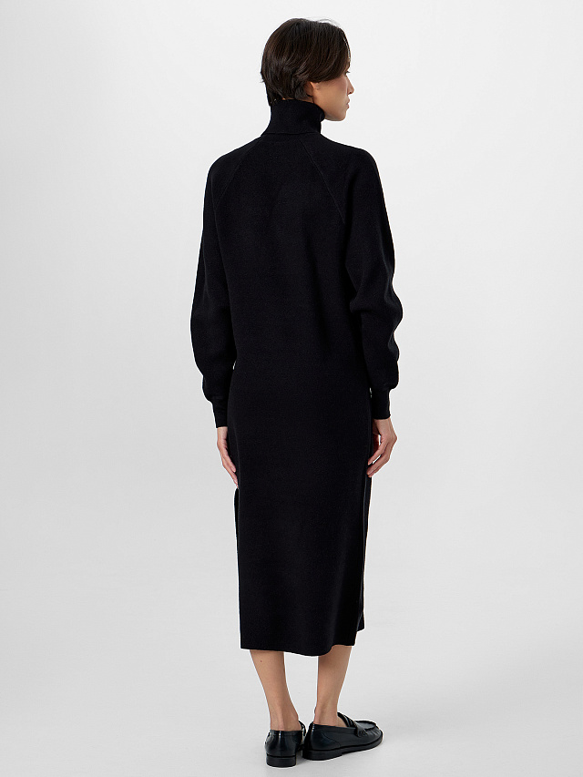 Женское черное платье с длинными рукавами — элегантная модель для прохладного сезона. Высокий воротник-стойка не только эффектно обрамляет шею, но и надежно защищает от холода. Длина ниже колен и рукава, зауженные на манжетах, создают утонченный, вытянутый силуэт. Стильный вырез на левом бедре — вносит в образ ноту современности.