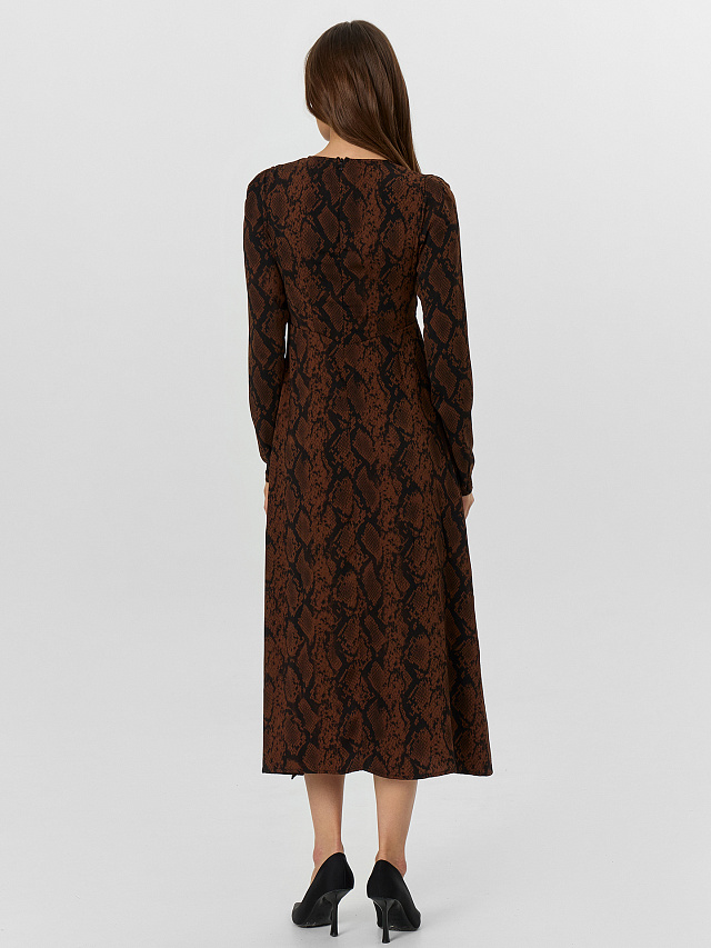 Змеиный принт на глубоком коричневом фоне создает эффектный контраст и легко сочетается с аксессуарами в нейтральной гамме. Платье подходит для вечеринок, коктейльных мероприятий или повседневных выходов — его можно дополнить кожаными акцентами или минималистичной бижутерией.