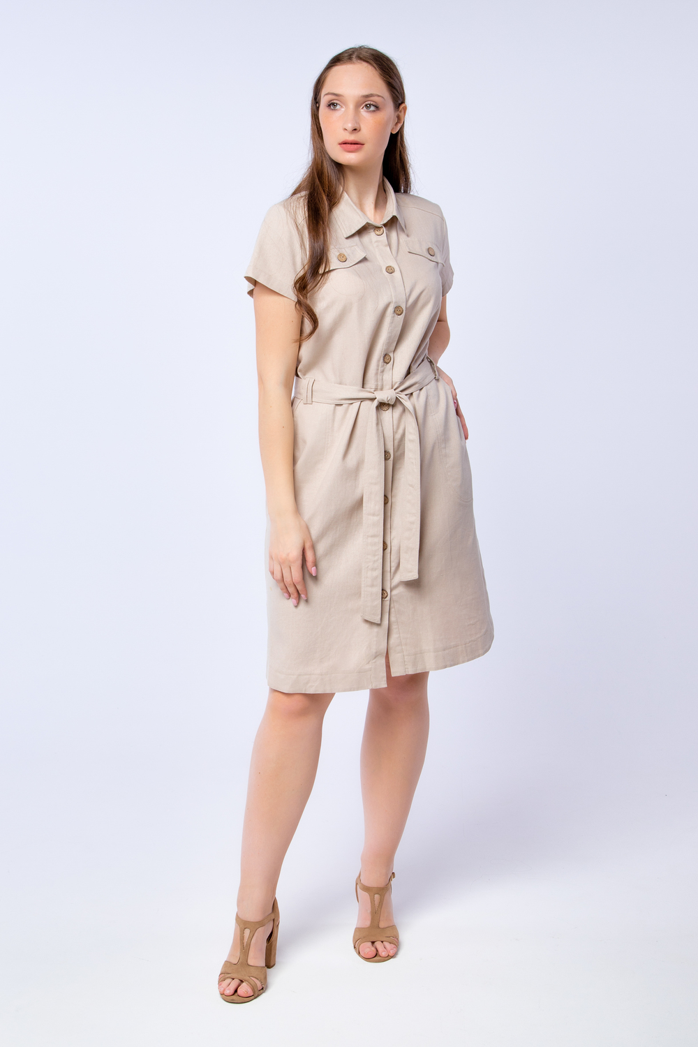Женское платье в стиле сафари отличный вариант как для офиса, так и для летних прогулок. Центральная застёжка на пуговицах создать правильную вертикаль и вытянет силуэт, а пояс выгодно подчеркнёт изгибы фигуры. В изделии предусмотрены боковые карманы и плечики, которые при желании можно отпороть. Лён, из которого выполнено платье, является экологичным и дышащим материалом. Пуговицы из дерева отлично дополняют дизайн платья.