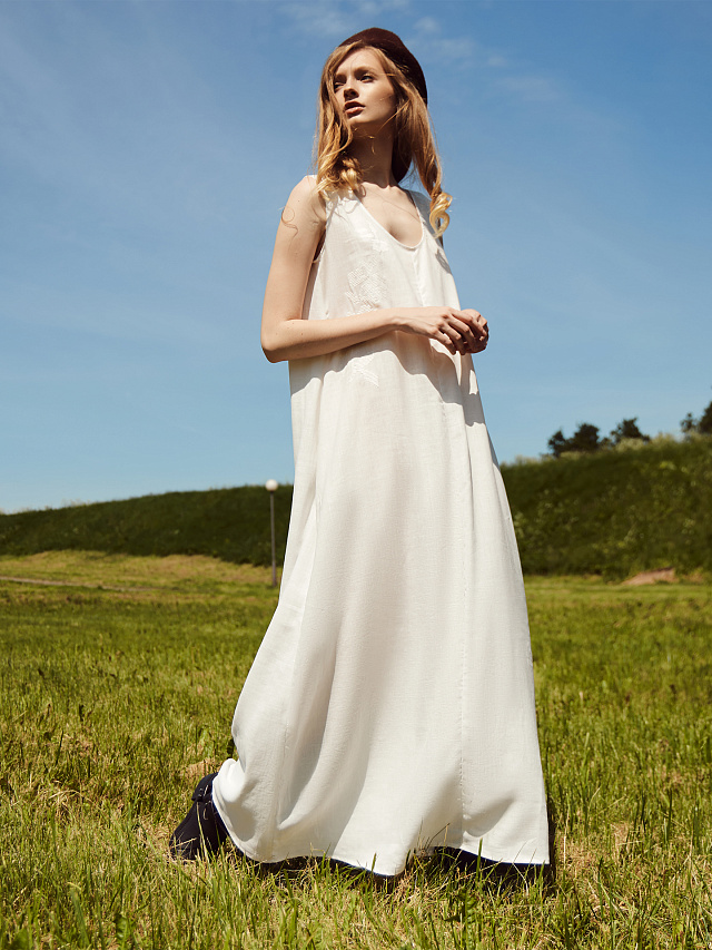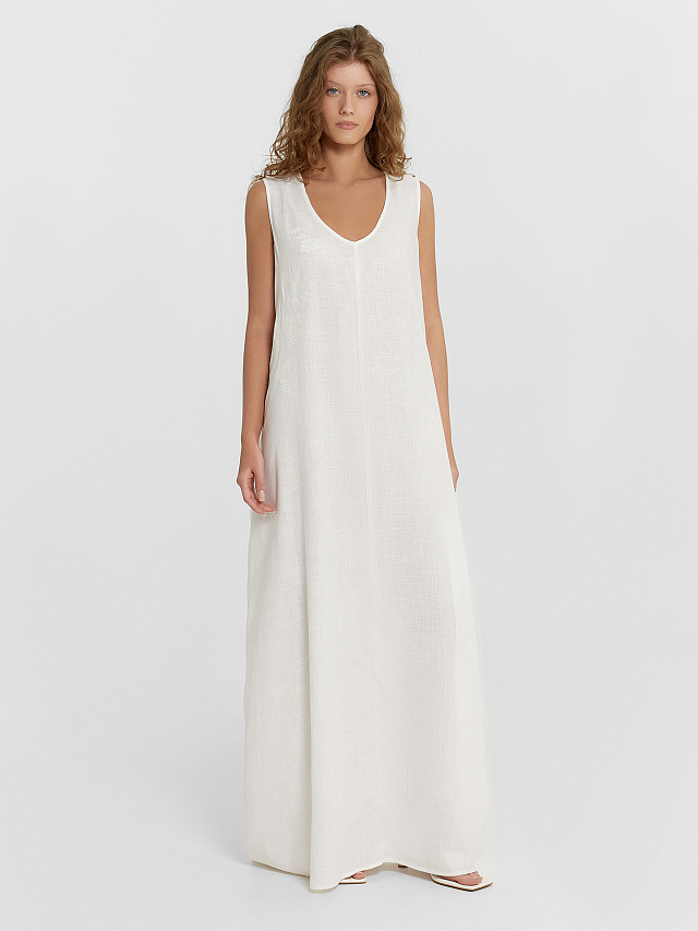 Женское платье макси А-силуэта — это элегантная и воздушная модель, идеально подходящая для теплого времени года. Углубленная V-образная горловина подчеркивает линию декольте, придавая образу женственность и легкость. Горловина и проймы аккуратно окантованы бейкой из основного полотна, что обеспечивает чистую отделку и сохраняет форму изделия. Перед и спинка выполнены со средним швом, что визуально вытягивает силуэт и подчеркивает вертикаль. В боковых швах предусмотрены удобные карманы, которые добавляют практичности, не нарушая лаконичности дизайна. Нижний срез обработан швом вподгибку, что придает изделию аккуратный и завершенный вид. Платье выполнено из сочетания лиоцелла и рами — натуральных волокон, известных своей прочностью, воздухопроницаемостью и приятной текстурой. Такая ткань мягко струится по телу, не перегревает и дарит ощущение комфорта даже в жаркую погоду. Это платье станет отличным выбором для прогулок, отдыха или летних мероприятий, сочетая в себе стиль, удобство и натуральную эстетику.