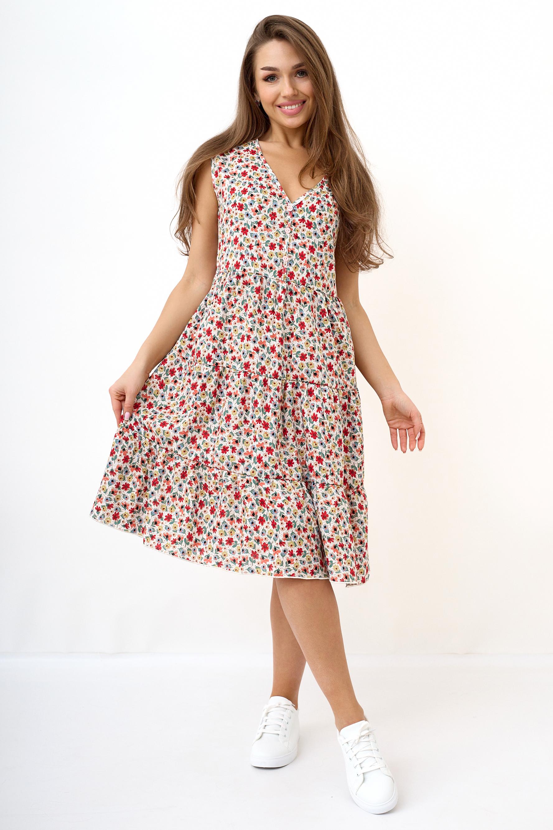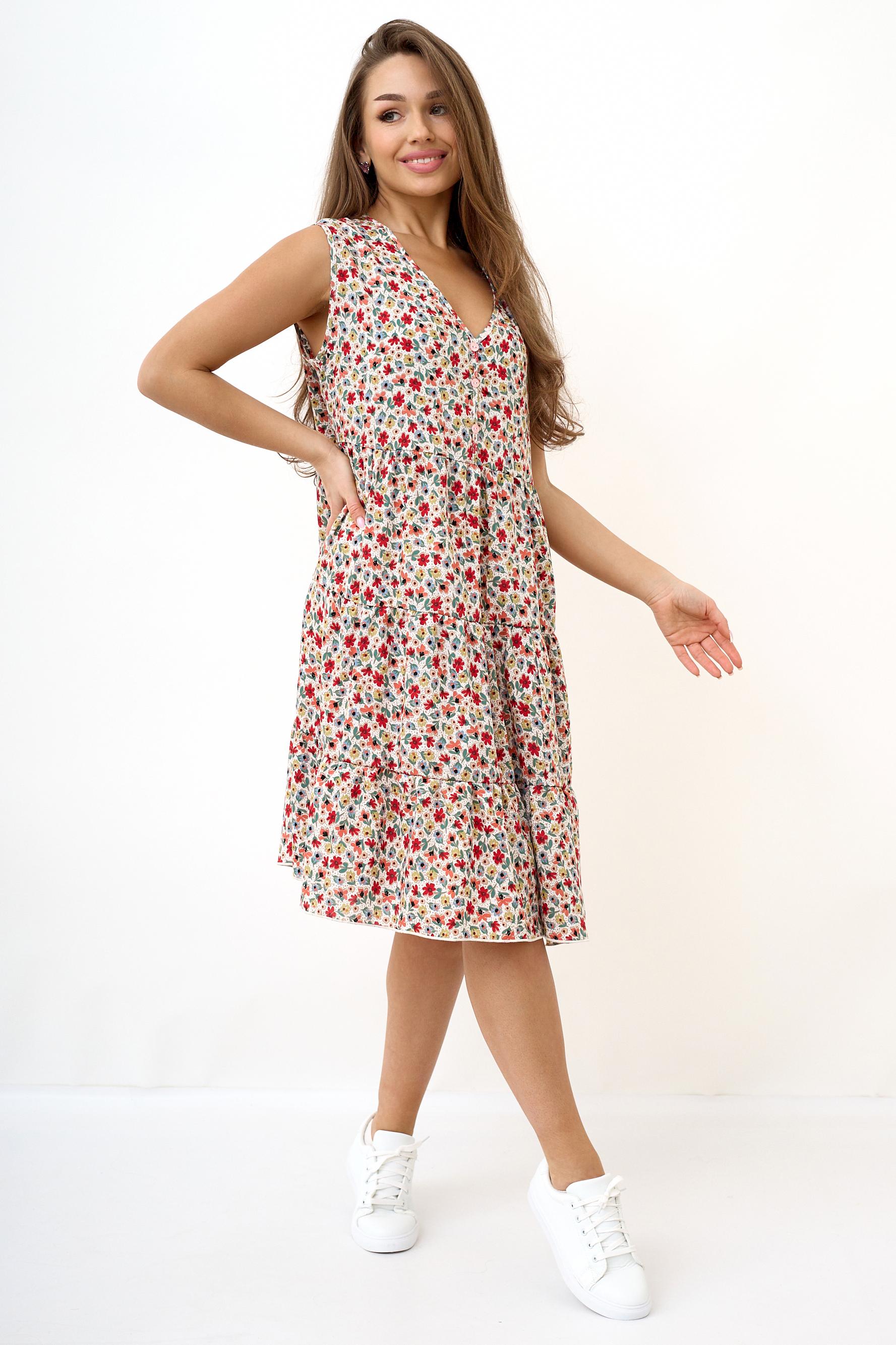 Легкое, воздушное летнее женское платье Саммер свободного кроя выполнено из тонкой вискозной ткани. Ткань не линяет и не теряет яркости. Платье отрезное выше линии талии, без рукава. Идеальный выбор для жаркого лета. Модель будет уместно смотреться как на прогулке, так и на работе, а также подойдет под любой формат мероприятия.