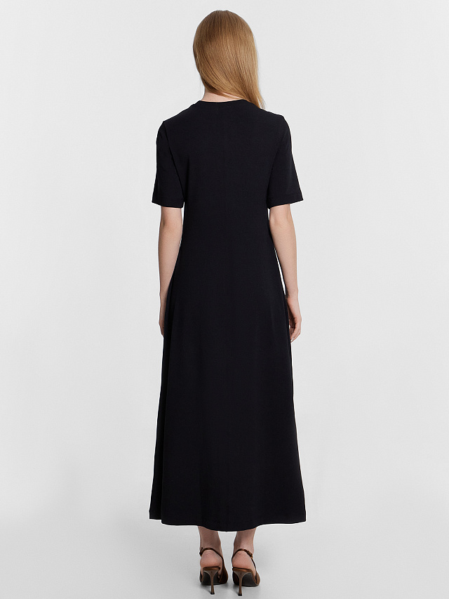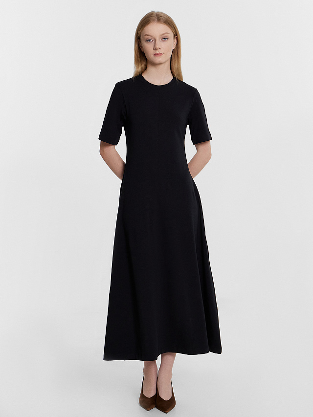 Длинное платье женское полуприлегающего силуэта из высококачественного хлопка и модала. Мягкое и невероятно комфортное. Отлично садится по фигуре. Горловина круглой формы. Рукав широкий, длиной чуть выше локтя. На детали переда и спинки центральные членения с отделочными строчками. Низ платья расширяется к низу. Стильная и комфортная модель — отличный вариант для создания красивых летних образов. Широкий размерный ряд. Миди представлено в нескольких базовых цветах.