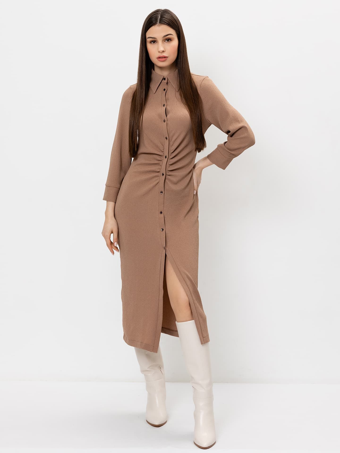 Однотонное платье женское с длинными рукавами, прилегающего силуэта из высококачественного материала. Платье полуприлегающего силуэта из ткани. Горловина круглой формы с воротником. Спереди выполнена центральная застежка на пуговицы. Рукав втачной, длиной 3/4. Платье длиной ниже колена. Отличное базовое платье, которое станет основой вашего стильного образа. Платье идеально подойдет для прогулок, встреч с друзьями, свидания. Очень стильная модель для запоминающихся офисных и городских образов. Откройте для себя широкий ассортимент наших платьев — это модели в различных цветах и вариантах длины. В них вы будете выглядеть элегантно и женственно, они украсят вашу фигуру, подчеркнут все ее достоинства. Каждое платье из нашей коллекции являетсяуникальным и добавит свой неотразимый шарм вашему образу. Выбирайте и сочетайте их с обувью и аксессуарами, создавая стильный и современный look. Мы уверены, что наши платья станут вашими любимыми и запоминающимися предметами гардероба, которые вы будете носить с удовольствием на любых мероприятиях.
