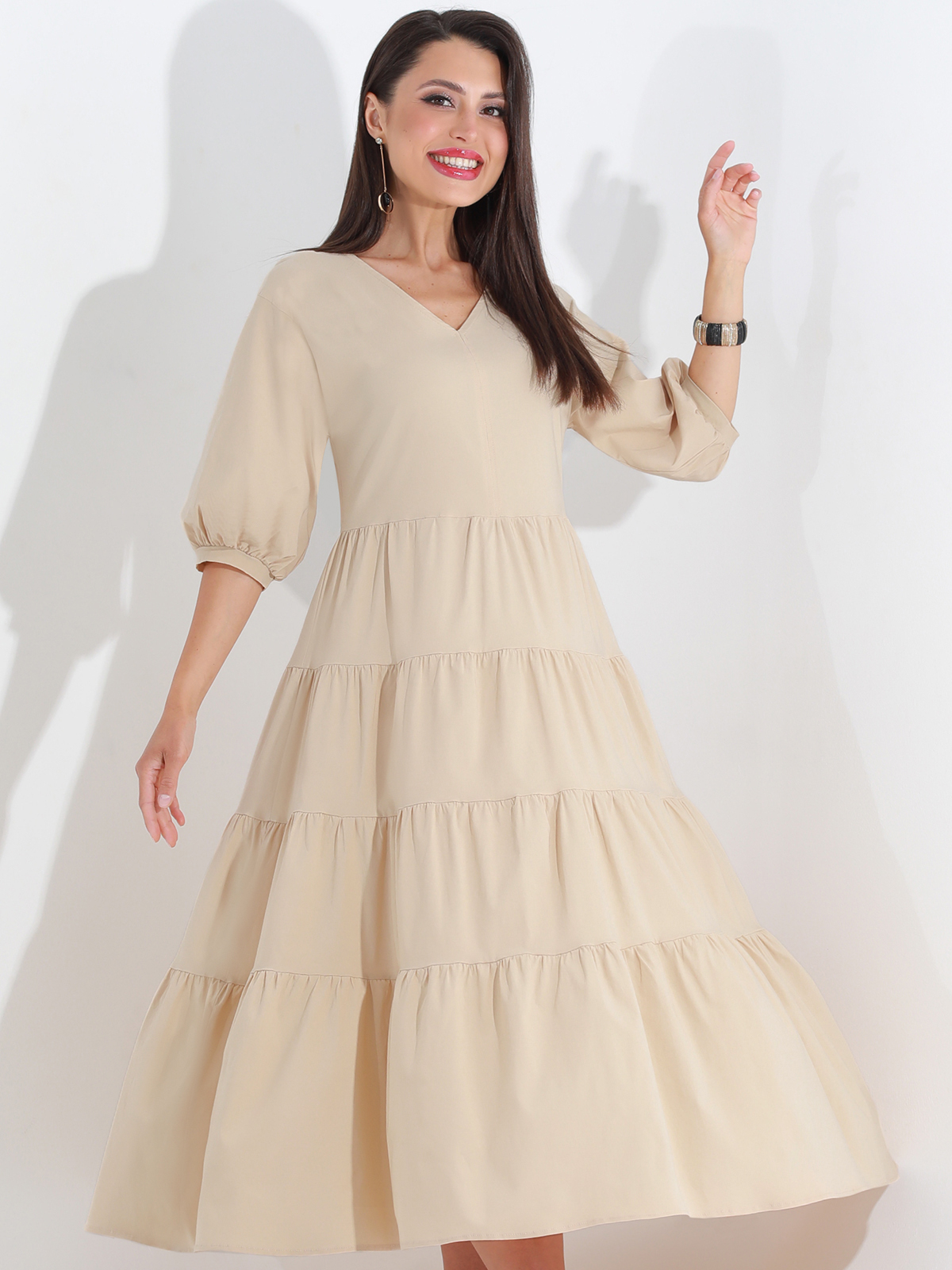 Летящее платье с воланами в бежевом цвете – это идеальный выбор для летнего гардероба. Его легкость и воздушность создают непринужденный и романтичный образ, подходящий для повседневных прогулок и встреч. Длинное платье в стиле А-силуэта создаёт изысканный и утончённый образ. А-силуэт подходит для разных типов фигуры, визуально вытягивая силуэт и придавая ему стройность. V-образный вырез горловины акцентирует внимание на декольте, добавляя образу нежности и утонченности. Одним из ключевых элементов дизайна этого платья являются воланы. Они придают изделию дополнительную легкость и воздушность, создавая романтичный и женственный образ. Воланы движутся вместе с вами, добавляя динамичности и игривости в каждое движение. Этот элемент делает платье уникальным и запоминающимся. Рукава длиной 3/4 обеспечивают оптимальный комфорт в летнюю погоду. Для ухода за платьем рекомендуется бережная стирка при температуре не выше 30 градусов. Это поможет сохранить форму и цвет изделия, обеспечивая ему долгий срок службы. Используйте мягкие моющие средства и деликатный режим стирки, чтобы избежать повреждений ткани и сохранить её первоначальный вид.