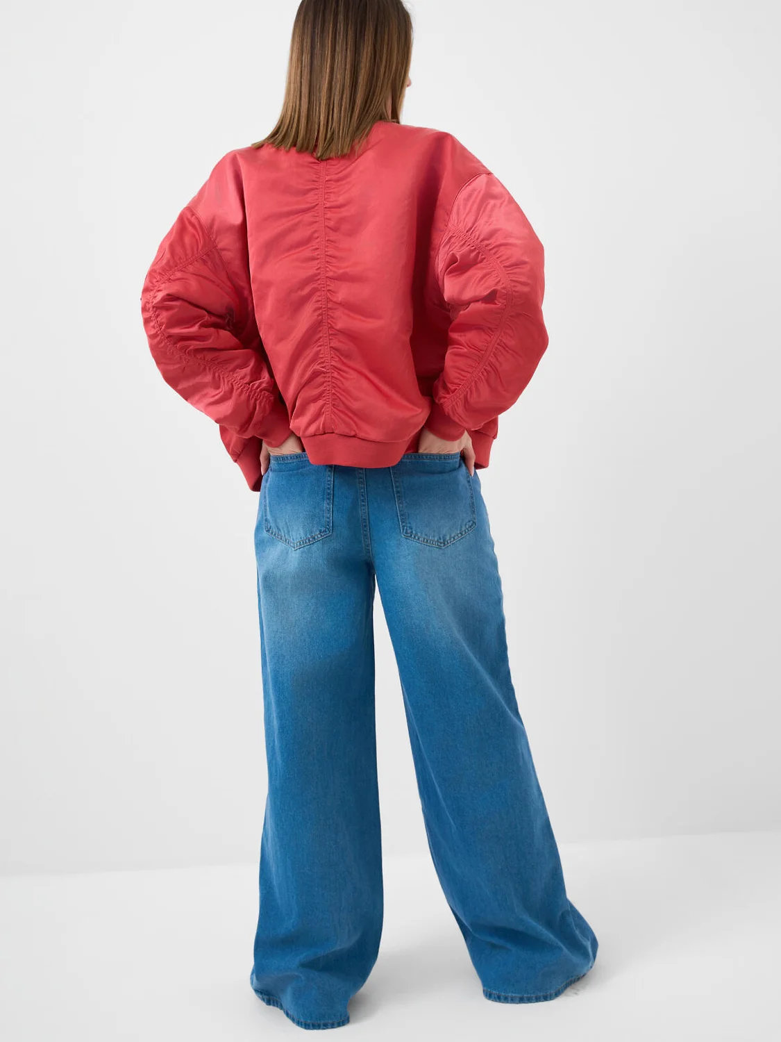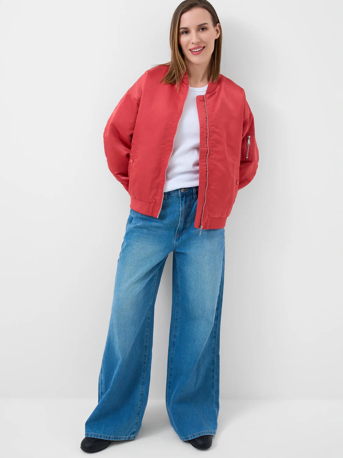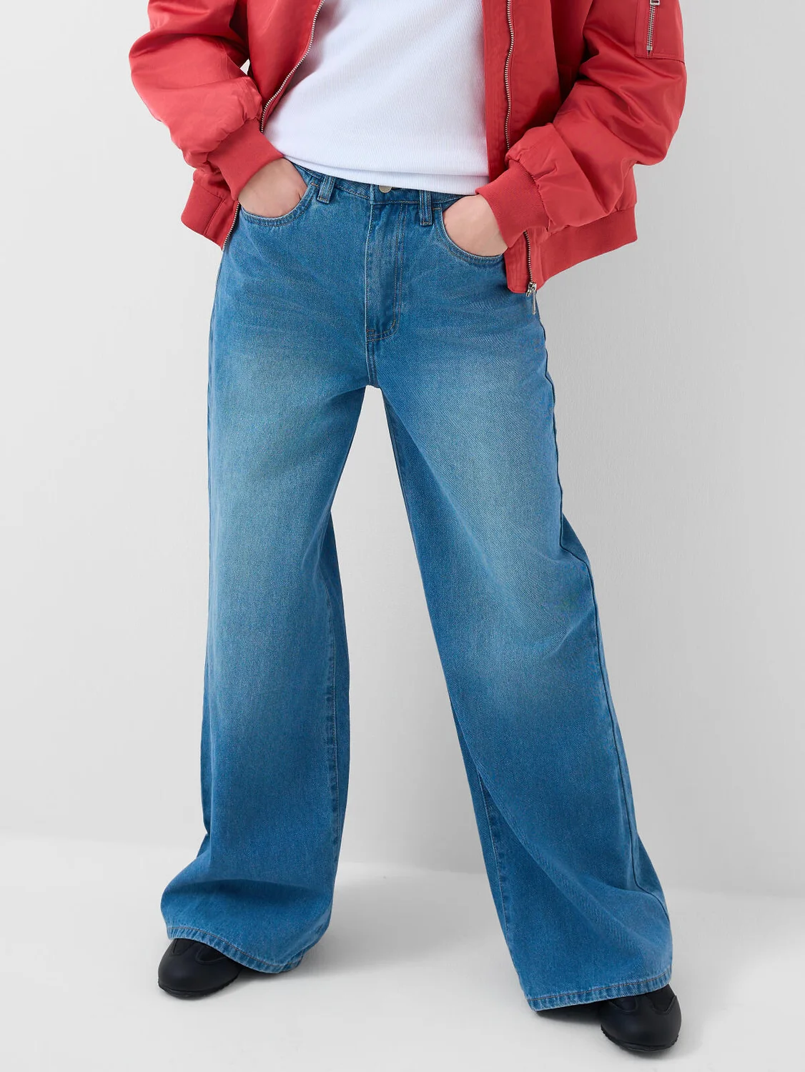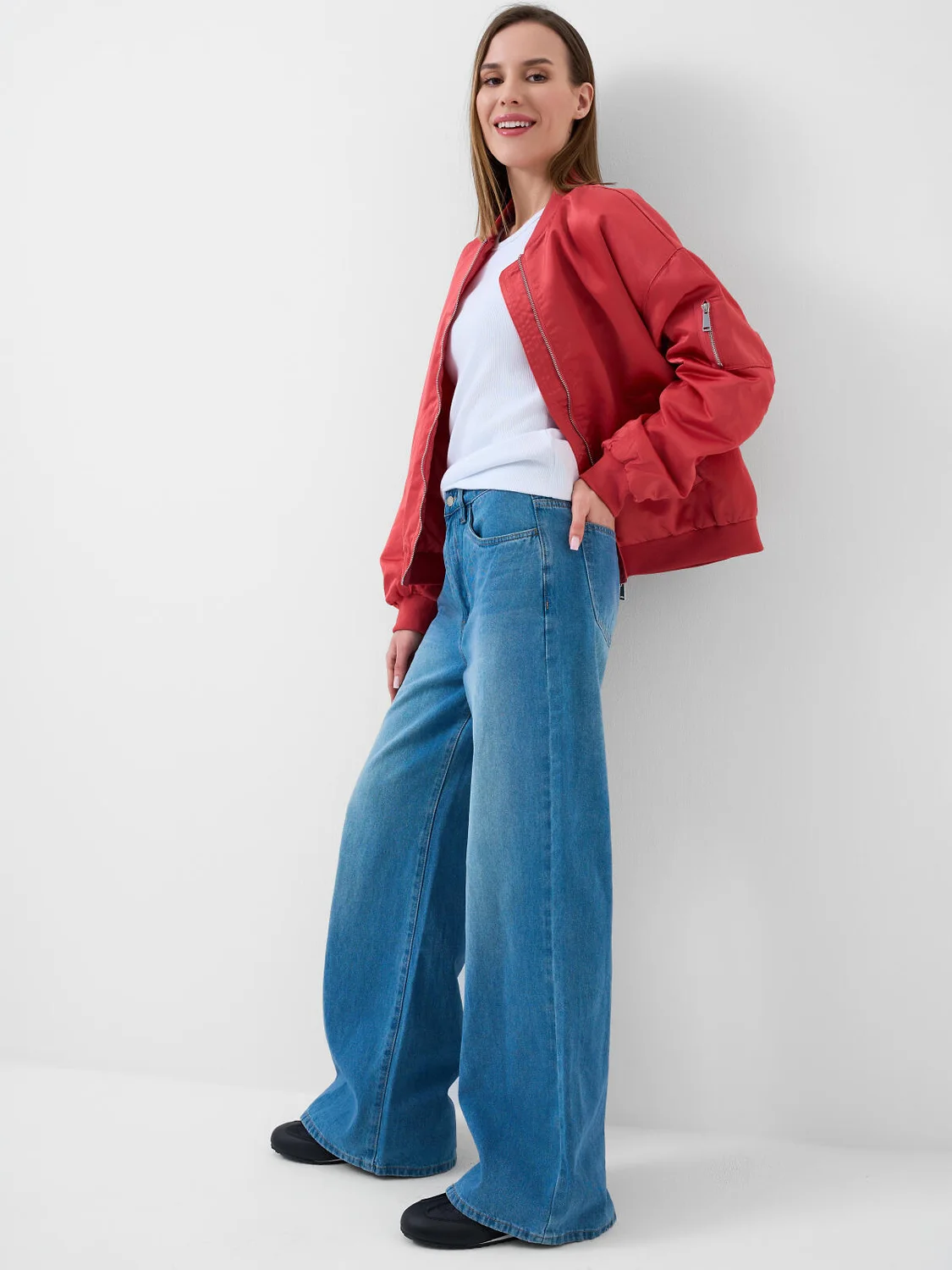 Женские широкие багги джинсы. Выполнены из светло-синего денима и имеют классический прямой крой с высокой посадкой. Спереди — два кармана, сзади — два накладных кармана. На поясе предусмотрены шлевки для ремня, а также регулируемая резинка с пуговицами внутри. Застежка — молния и болт.