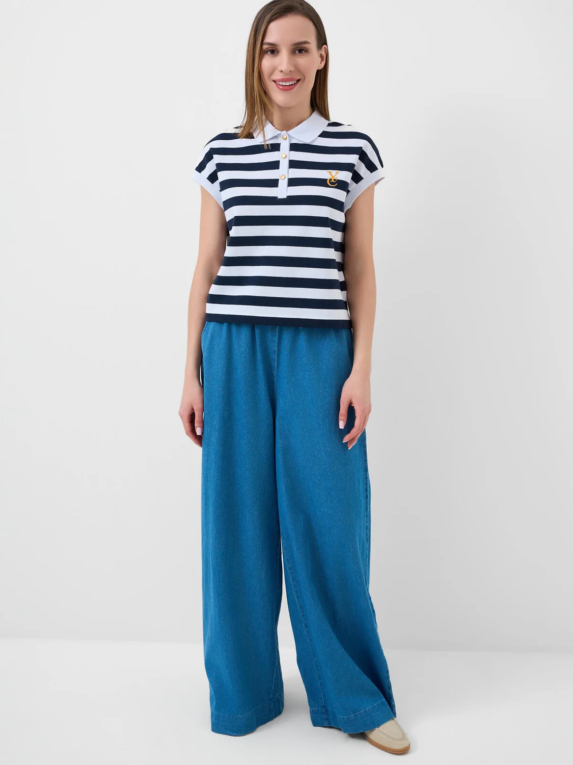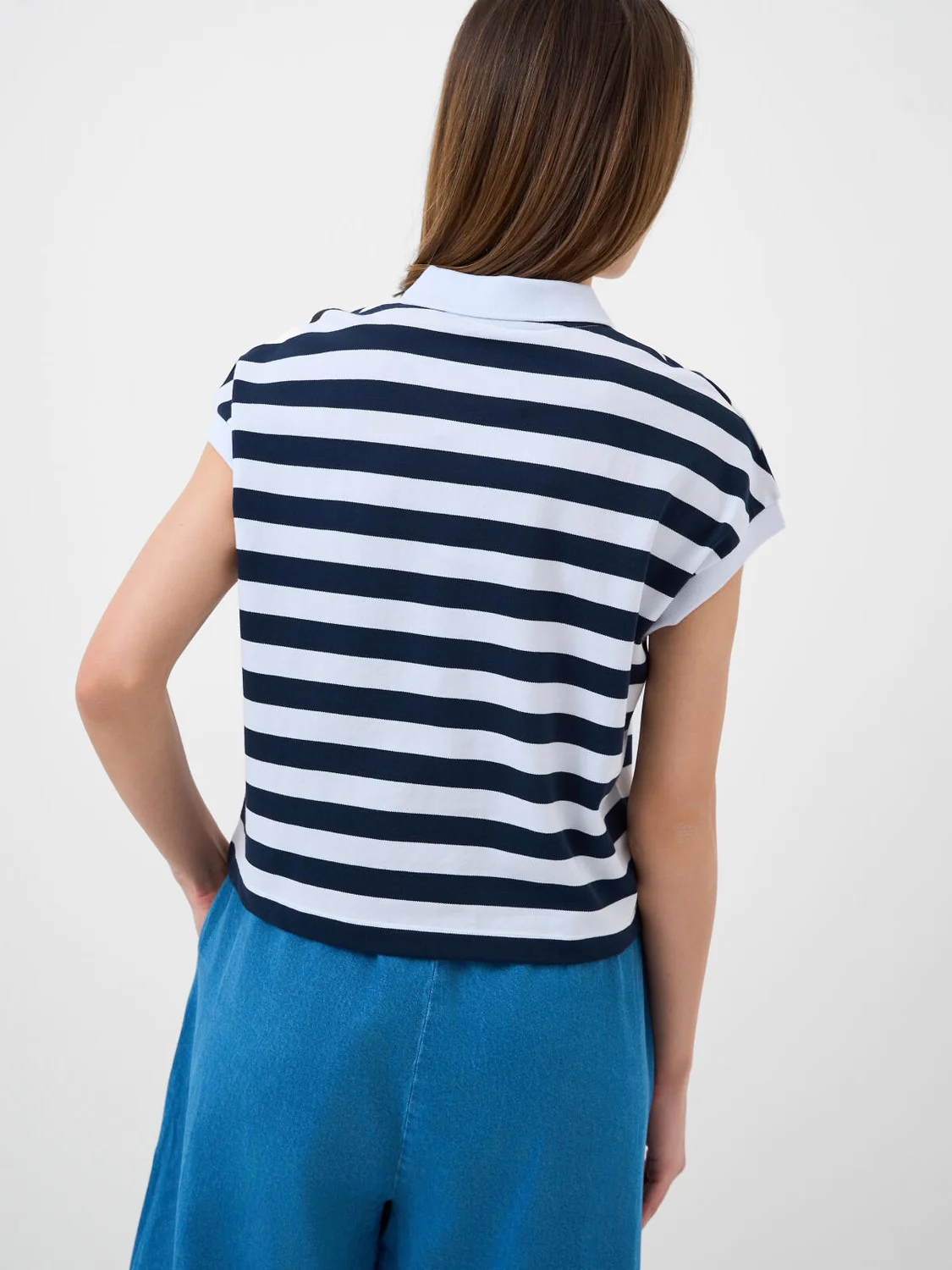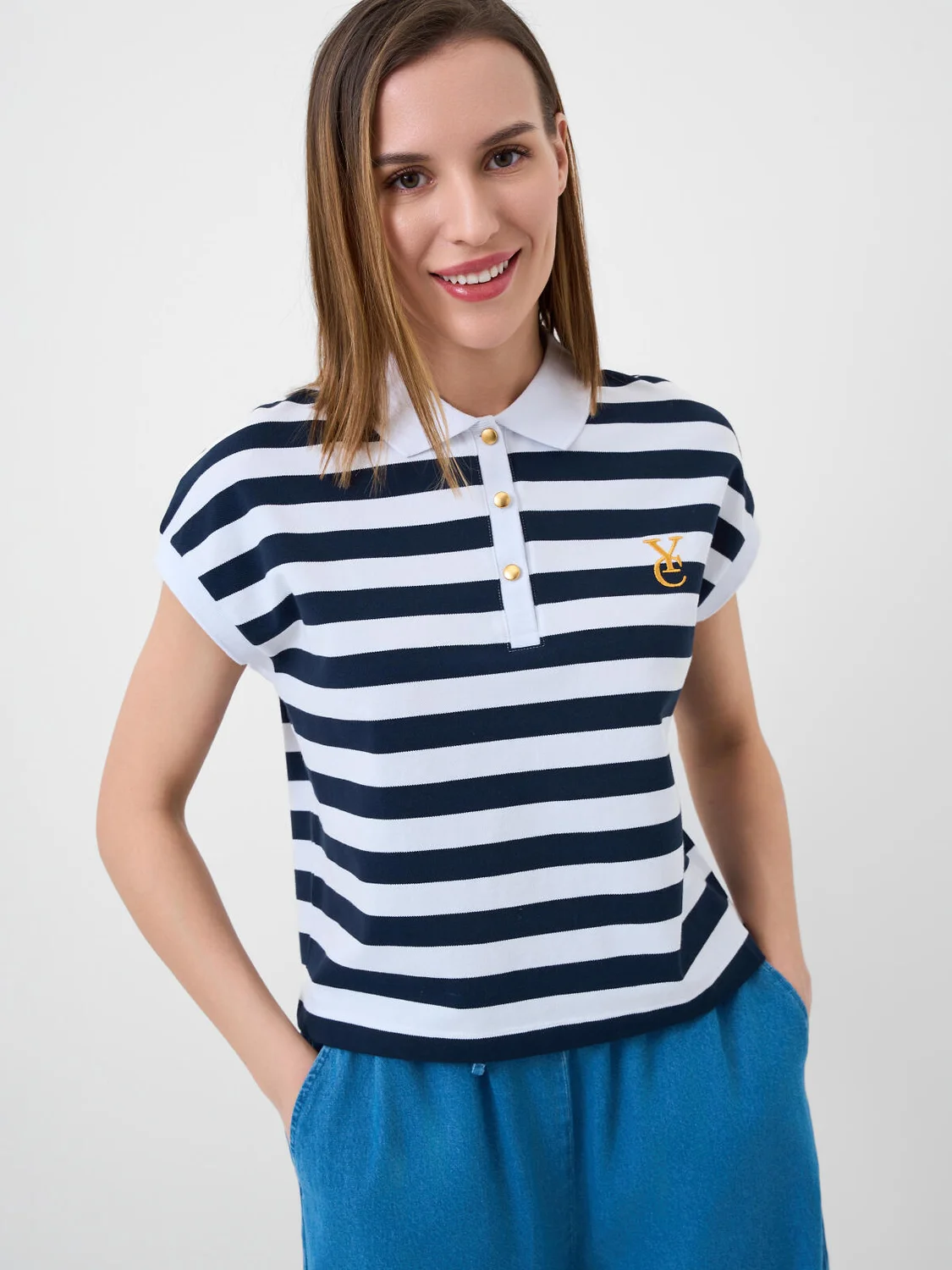 Женская футболка-поло в полоску. Модель прямого кроя, с коротким рукавом, выполненная из хлопкового трикотажа пике. Спереди — застежка на три кнопки.