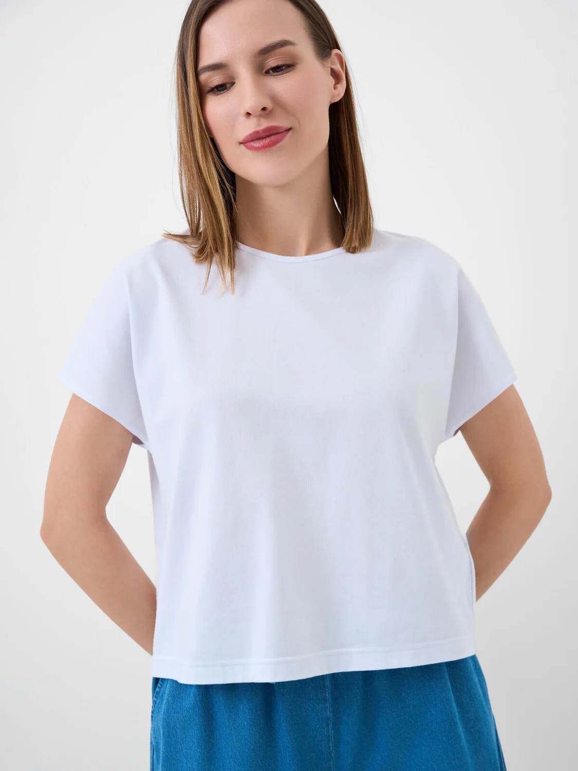 Женская базовая футболка. Модель свободного кроя, выполнена из эластичного хлопкового трикотажа джерси.