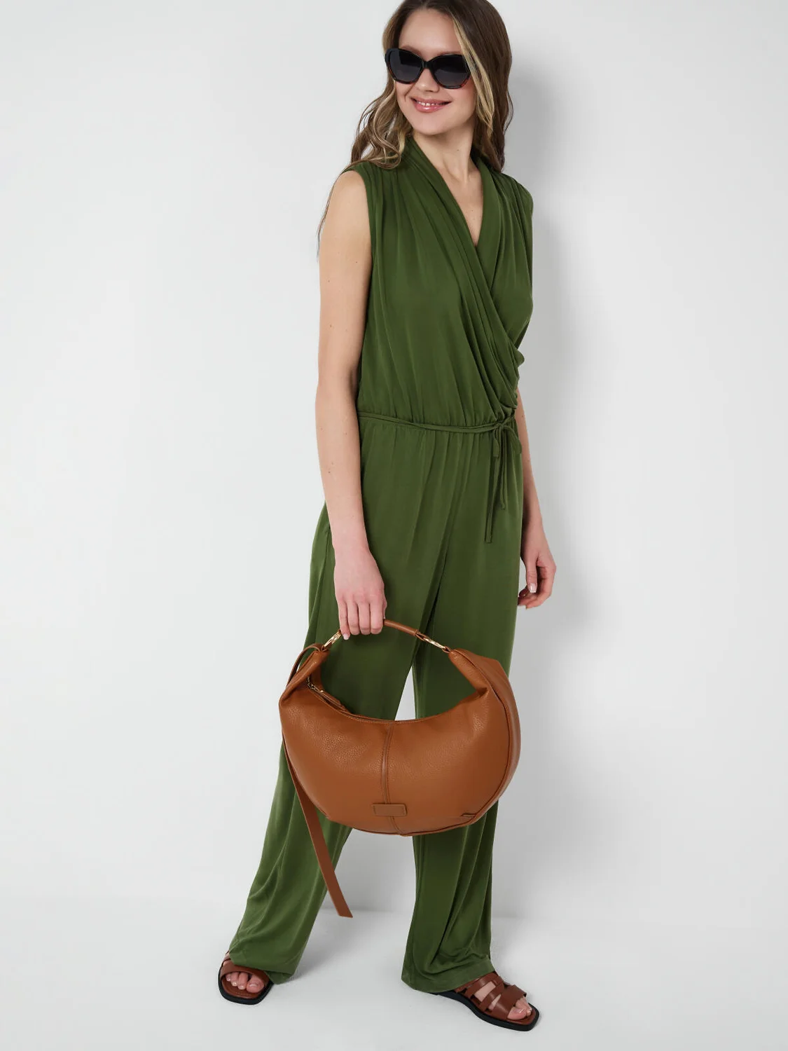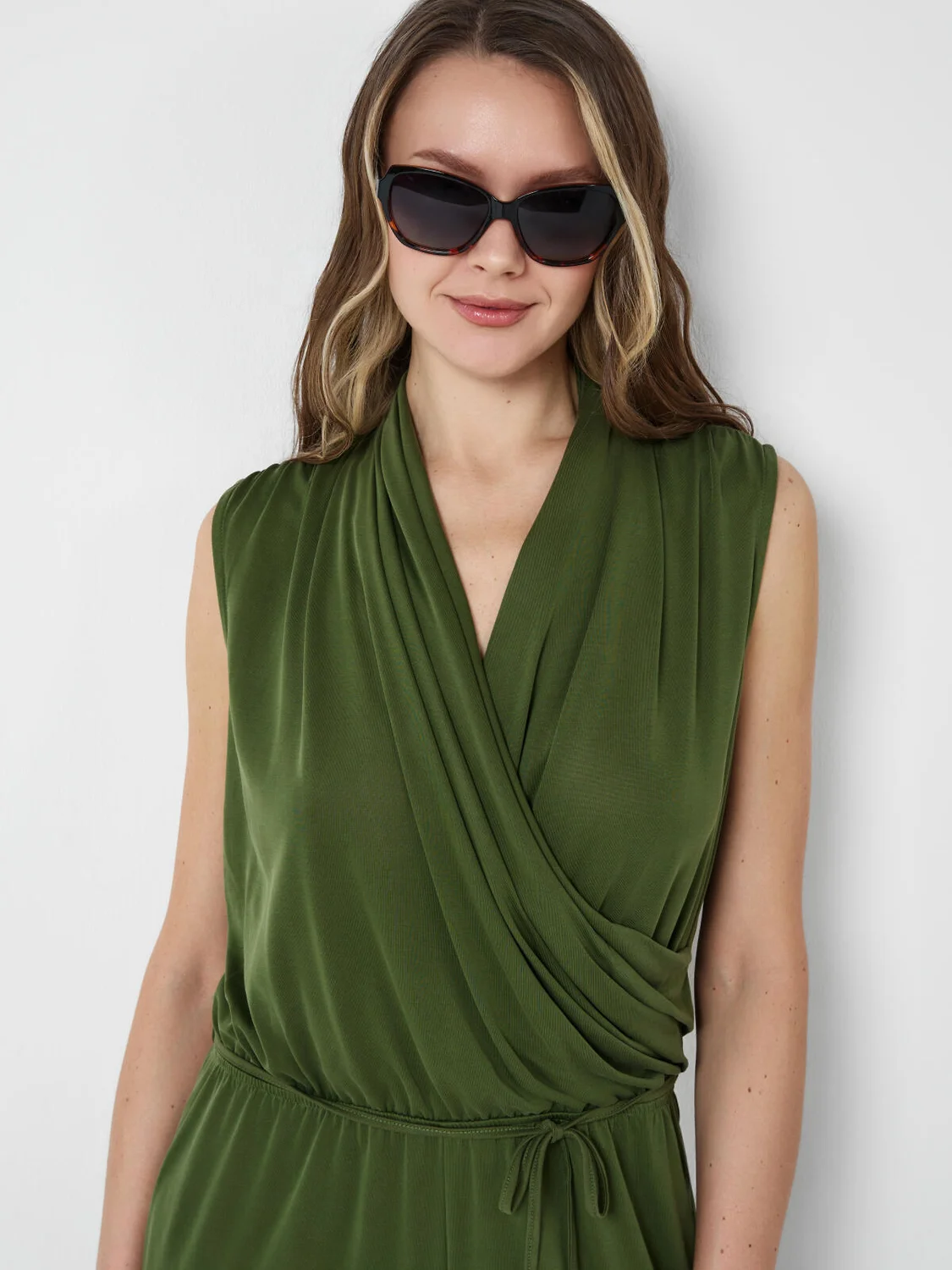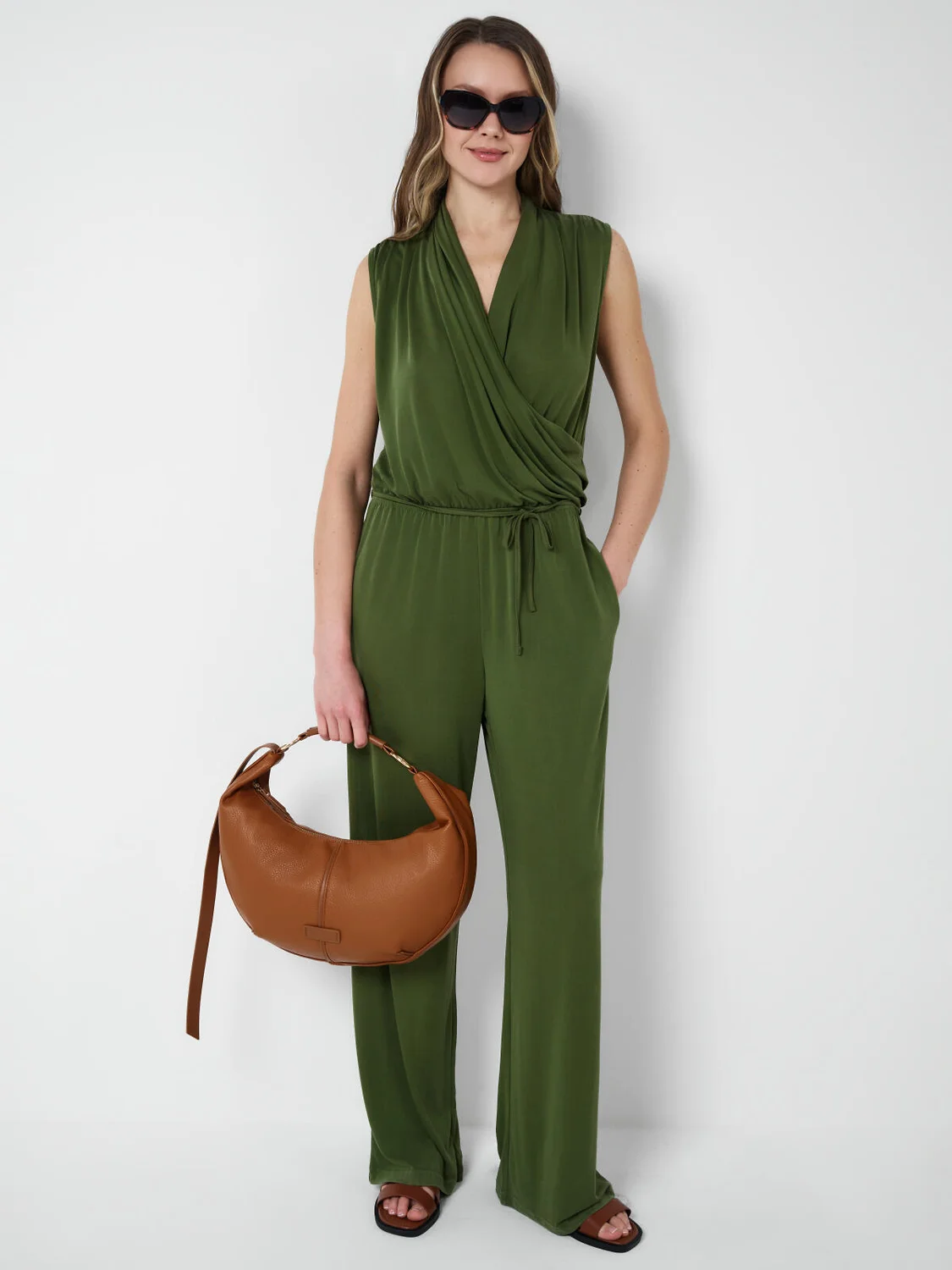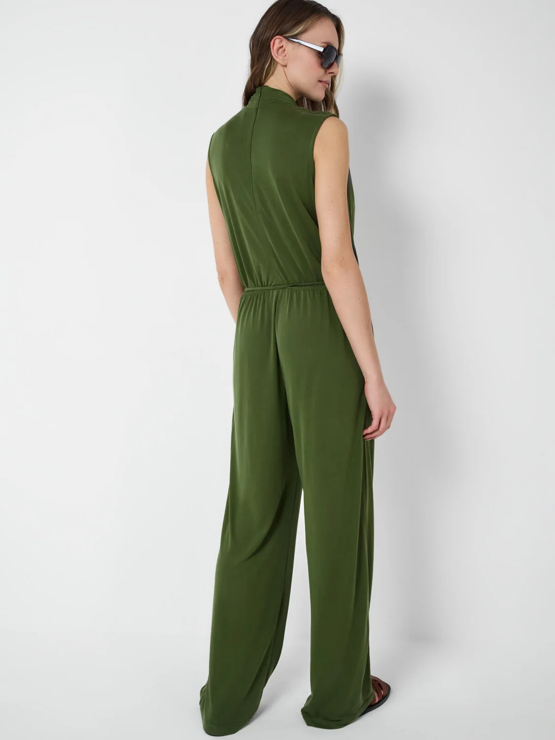 Женский брючный комбинезон. Верхняя часть изделия красиво драпирована, создавая элегантный образ. На талии – эластичная вставка и дополнительный шнур для регулировки объёма. По бокам два удобных кармана. Застёжка – потайная молния на спинке.
