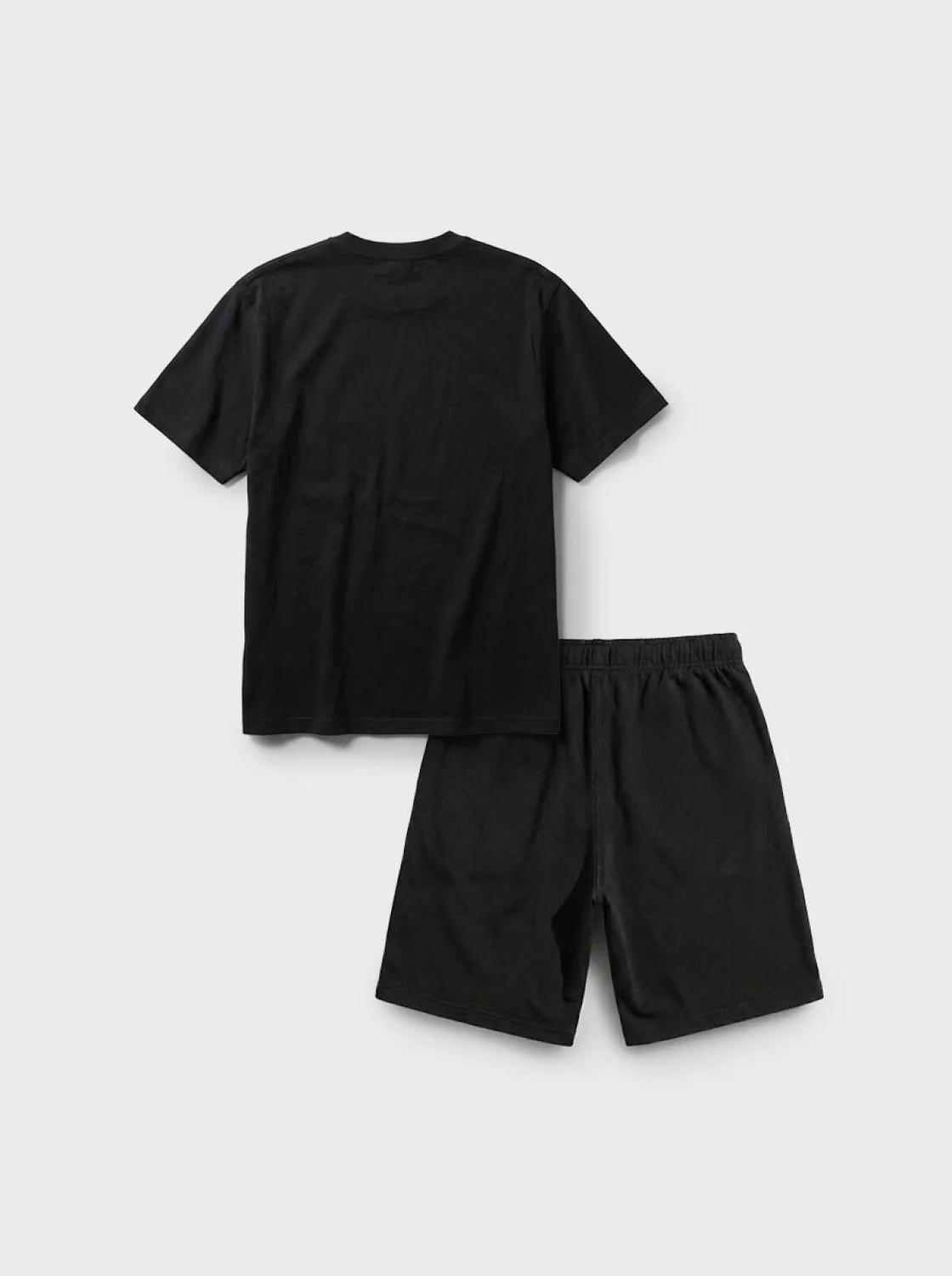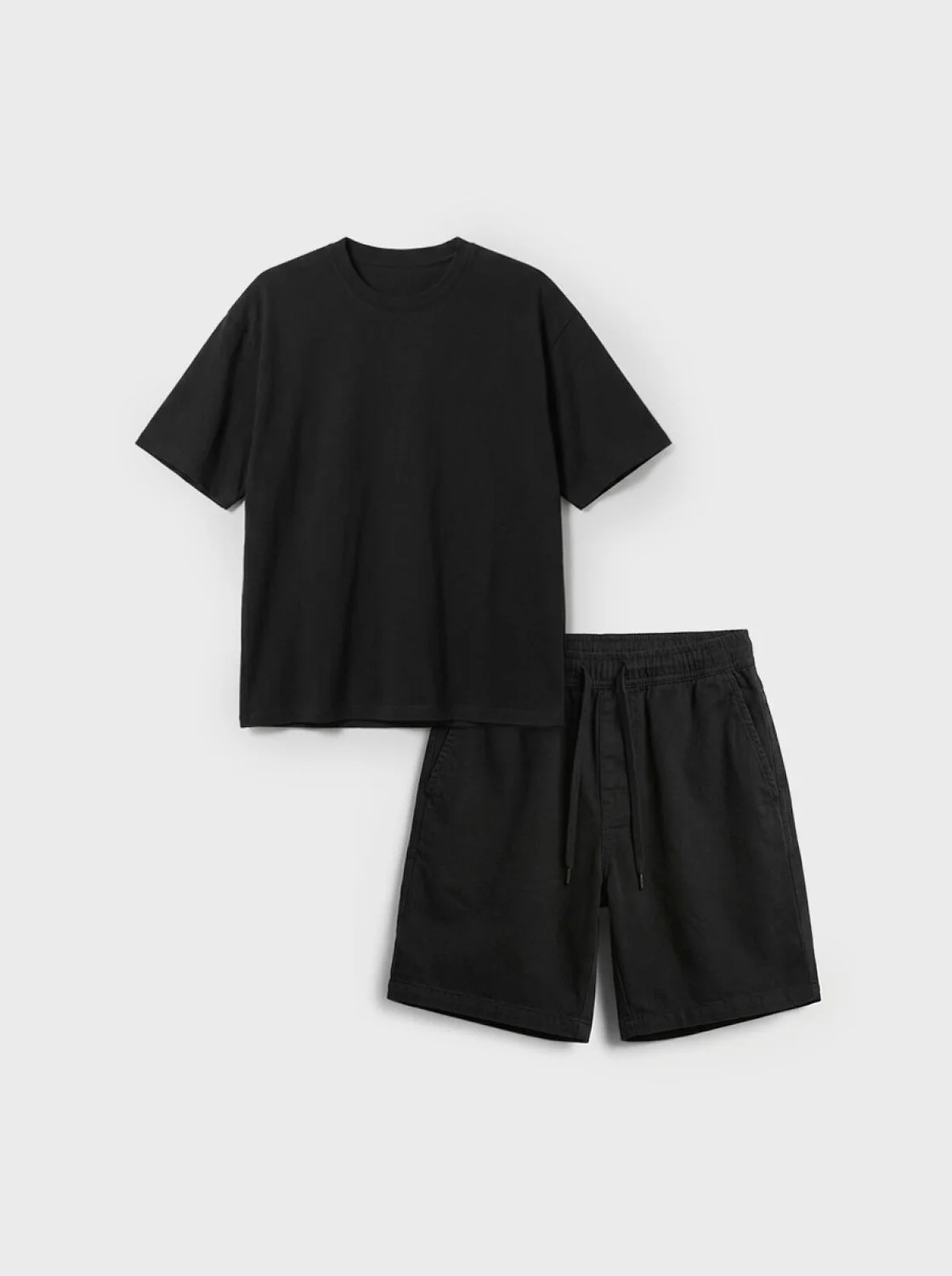 Женский базовый костюм. Состоит из футболки и шорт. Выполнен из хлопкового трикотажа. Футболка оверсайз, с коротким рукавом. Шорты свободные, с эластичным поясом и шнурком для регулировки посадки. По бокам расположены карманы.