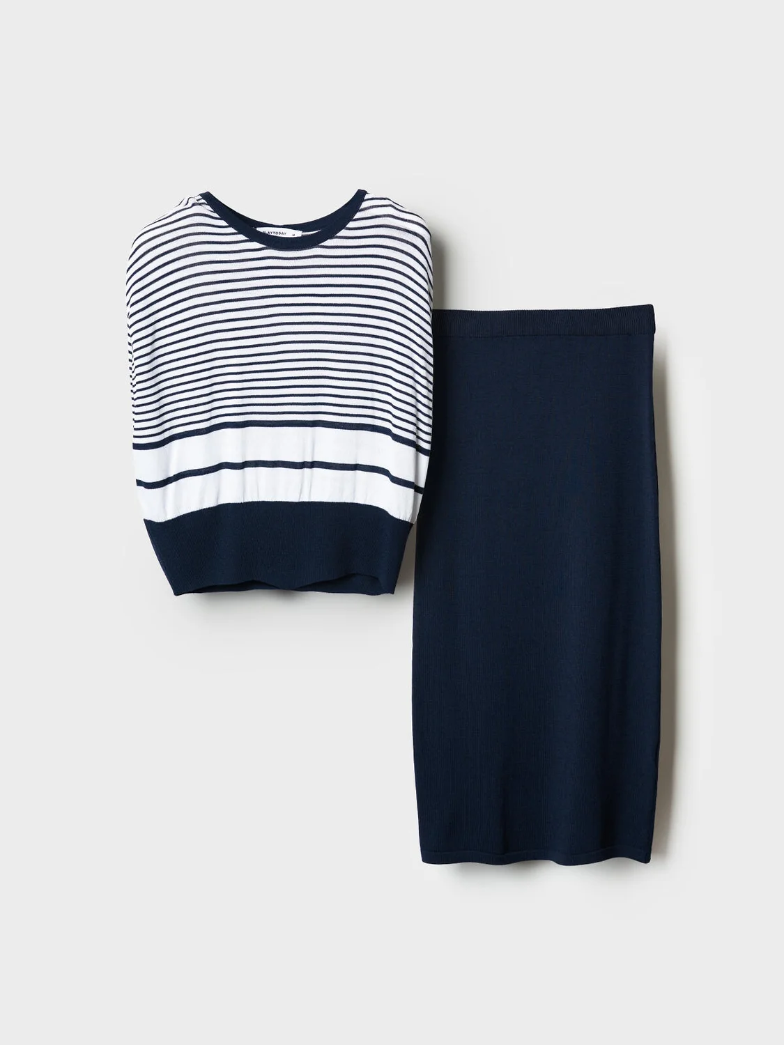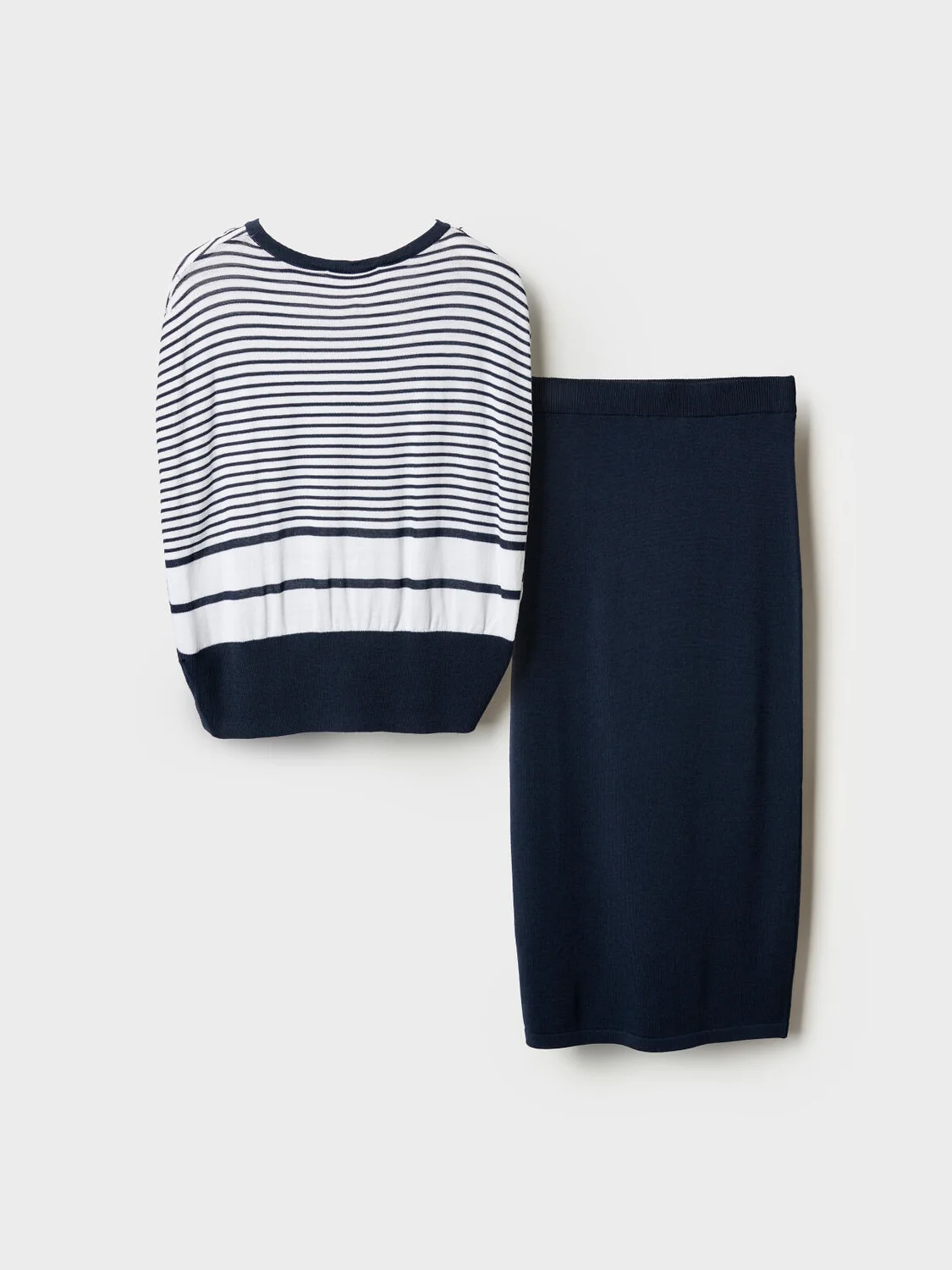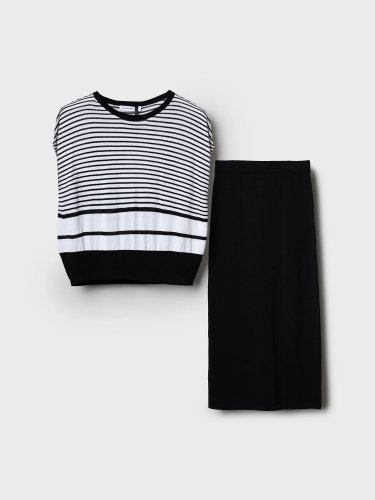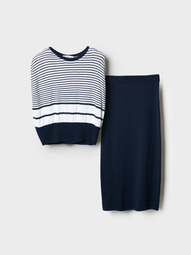 Женский комплект из вязаного трикотажа. Состоит из джемпера и прямой юбки. Джемпер свободный, с круглой горловиной. Юбка однотонная, в длине миди. Внизу джемпера — резинка для комфортной посадки. Материал — мягкий и эластичный вязаный трикотаж, приятный к телу.